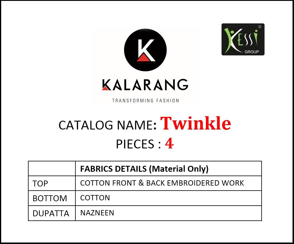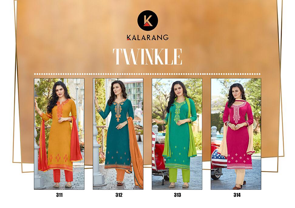 Buy Online Twinkle By Kalarang 311 Series Fancy Cotton Embroidery Salwar Kameez Catlog Wholesale Dealer Surat 4 Pcs of Full Catalogue at Wholesale Price. Looking for Twinkle By Kalarang 311 Series Fancy Cotton Embroidery Salwar Kameez Catlog Wholesale Dealer Surat Full Catalouge at Best Price? Buy Now Twinkle By Kalarang 311 Series Fancy Cotton Embroidery Salwar Kameez Catlog Wholesale Dealer Surat at Wholesale Rate of Rs 1996 with Total 4 Pcs from authroized dealer and supplier of KALARANG Brand. Cost of Each piece is just only Rs 499 which is very low and affordable price to resale the product in your retail store ,This is Surat based Wholesale Supplier & Dealer of KALARANG Brand. Click on Brand name to Know more about KALARANG Brand's products.Call or Whatsapp on 9898838984 for booking or enquiry