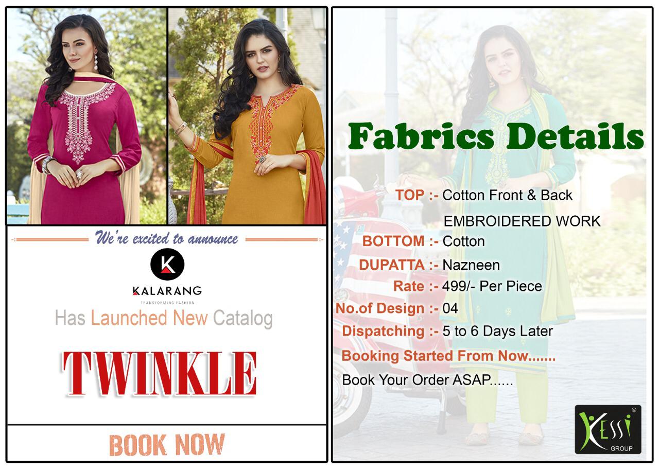 ? *Kalarang.* has launched _Catalog name_ : *Twinkle* ? _Fabric Details_ ? ?Top :- COTTON FRONT & BACK EMBROIDERED WORK ?Bottom:- COTTON ?Dupatta:- NAZNEEN ?Total Design :- 4 ?Dispatching 5 to 6 days later ?Booking started from now... ?Order yours soon.... Rate -499 per Pcs . Set To Set. GST 5 Percent Extra. |