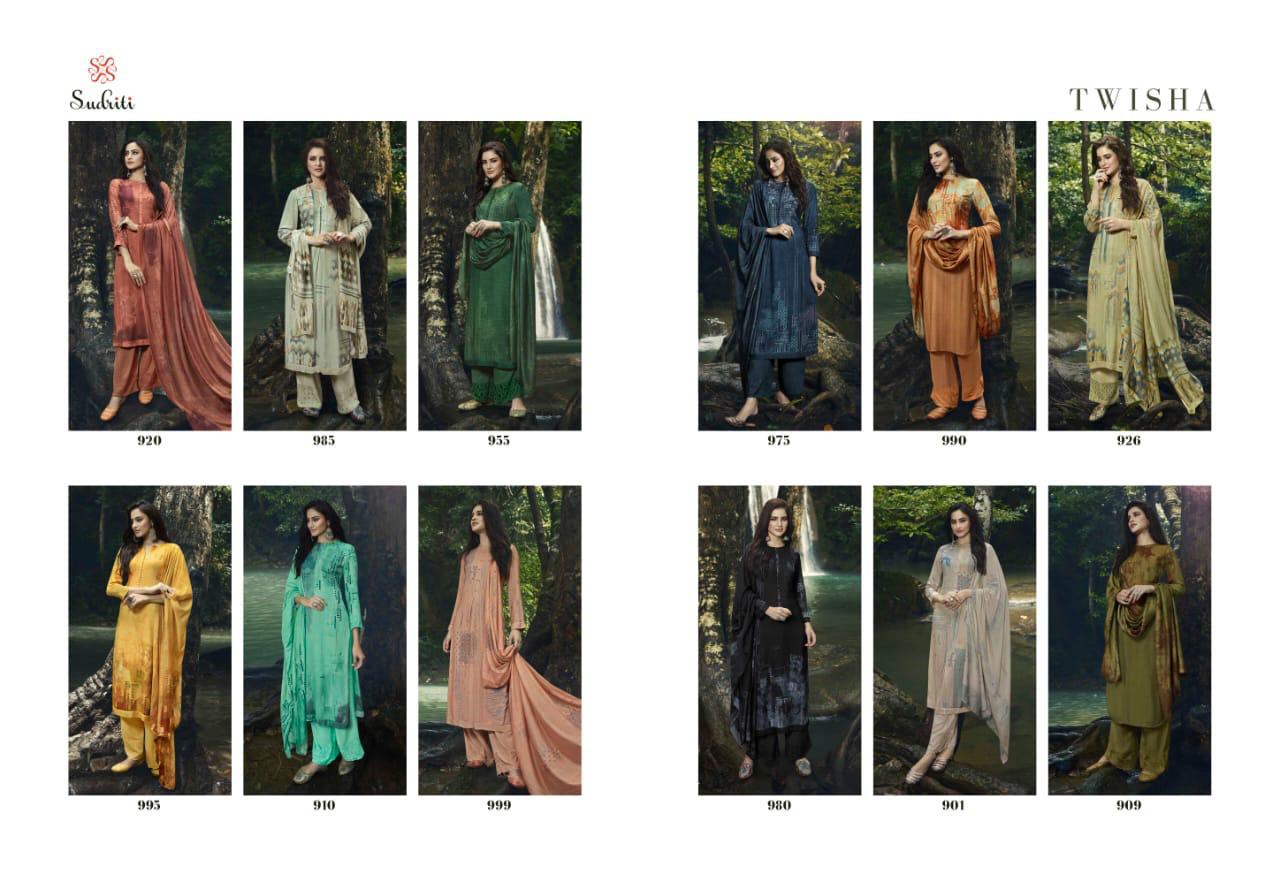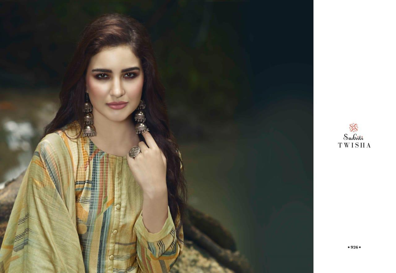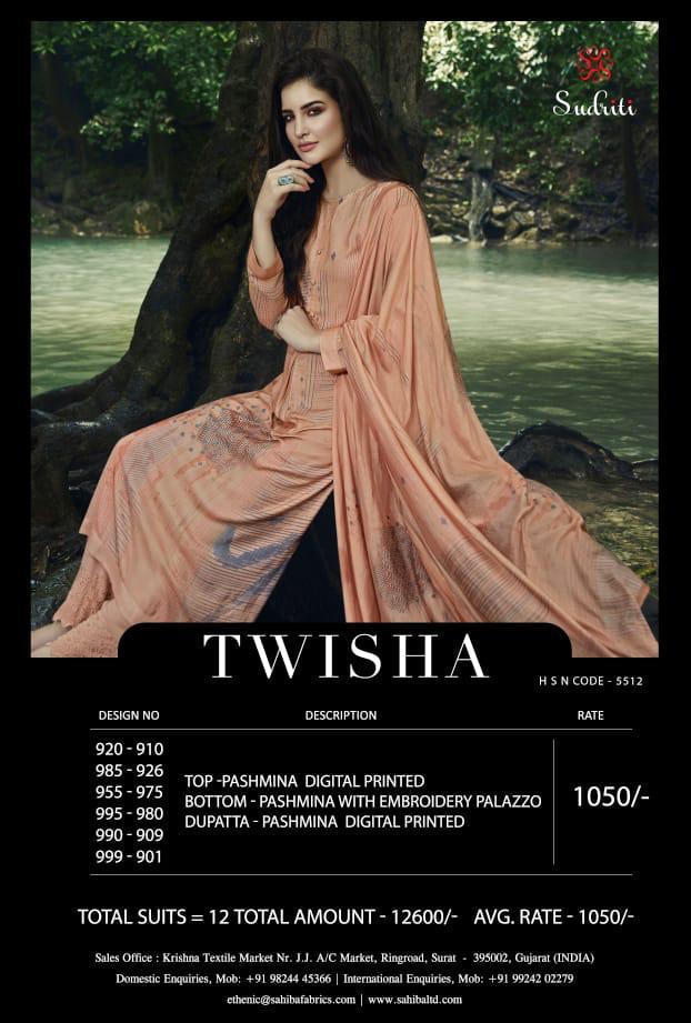 Buy Online Twisha By Sudriti Pashmina Dress Materials Wholesale Supplier India 12 Pcs of Full Catalogue at Wholesale Price. Looking for Twisha By Sudriti Pashmina Dress Materials Wholesale Supplier India Full Catalouge at Best Price? Buy Now Twisha By Sudriti Pashmina Dress Materials Wholesale Supplier India at Wholesale Rate of Rs 12600 with Total 12 Pcs from authroized dealer and supplier of SUDRITI Brand. Cost of Each piece is just only Rs 1050 which is very low and affordable price to resale the product in your retail store ,This is Surat based Wholesale Supplier & Dealer of SUDRITI Brand. Click on Brand name to Know more about SUDRITI Brand's products.Call or Whatsapp on 9898838984 for booking or enquiry