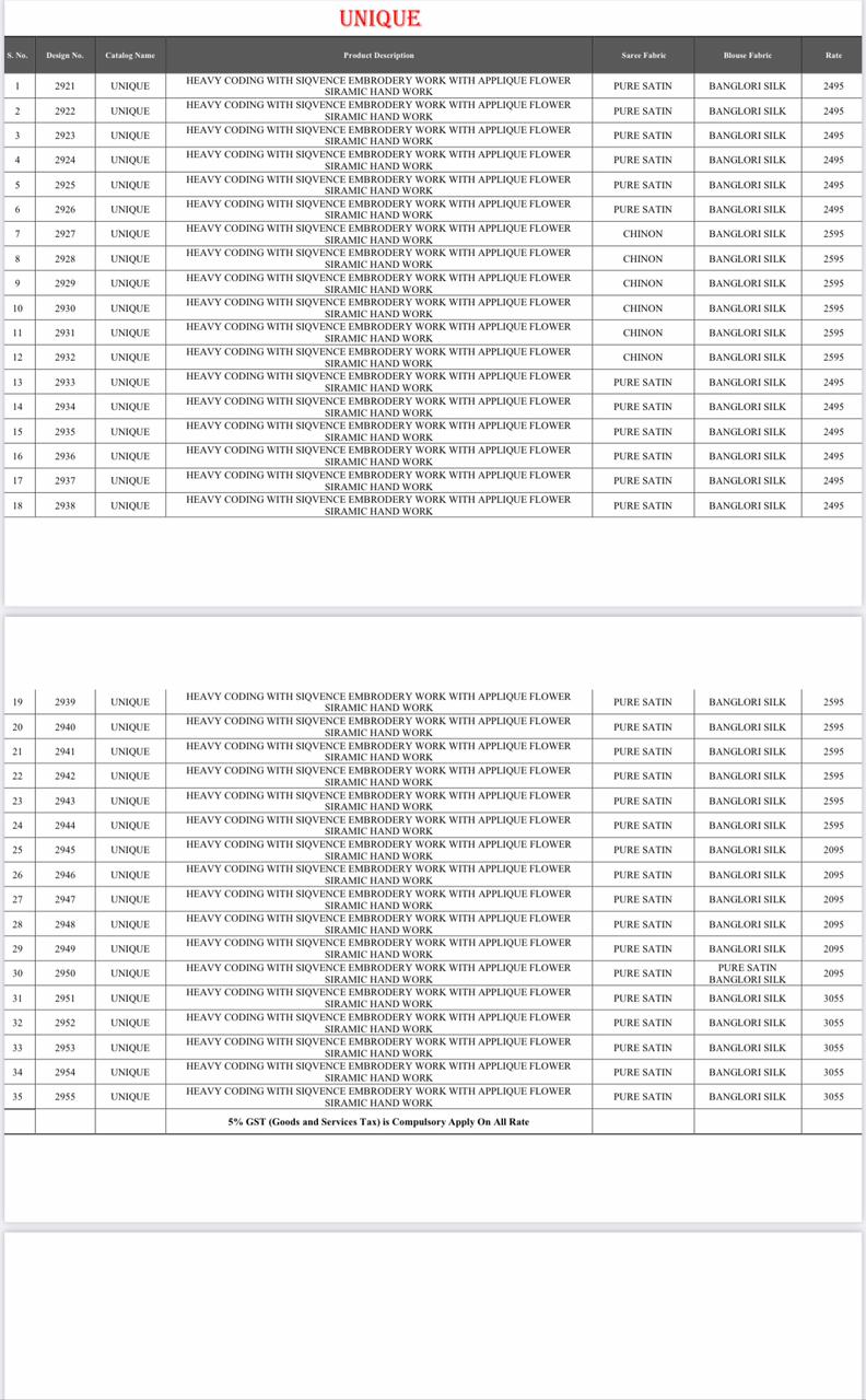 Buy Online Unique Series 2921 To 2955 By Naree Single And Set Stockiest And Supplier From Surat 35 Pcs of Full Catalogue at Wholesale Price. Looking for Unique Series 2921 To 2955 By Naree Single And Set Stockiest And Supplier From Surat Full Catalouge at Best Price? Buy Now Unique Series 2921 To 2955 By Naree Single And Set Stockiest And Supplier From Surat at Wholesale Rate of Rs 0 with Total 35 Pcs from authroized dealer and supplier of Nari Fashion Brand. Cost of Each piece is just only Rs 0 which is very low and affordable price to resale the product in your retail store ,This is Surat based Wholesale Supplier & Dealer of Nari Fashion Brand. Click on Brand name to Know more about Nari Fashion Brand's products.Call or Whatsapp on 9898838984 for booking or enquiry