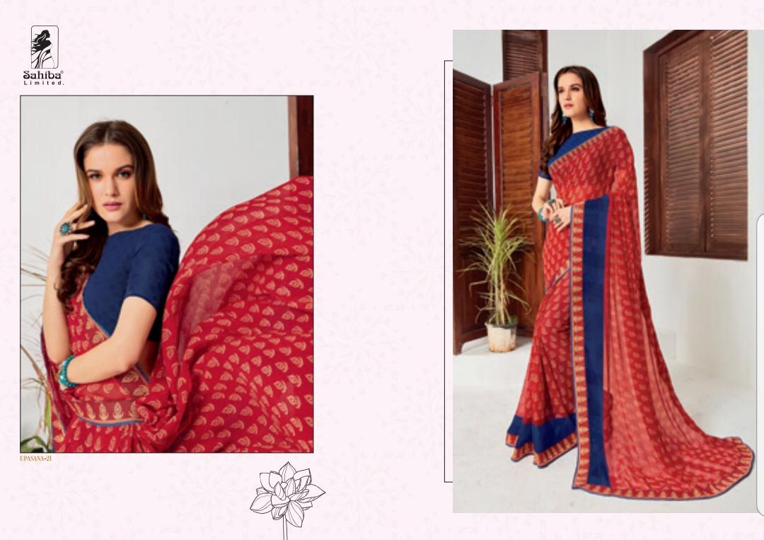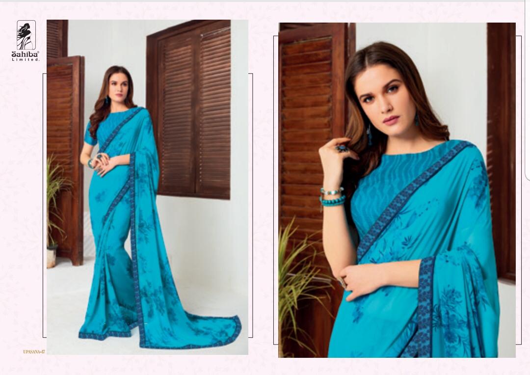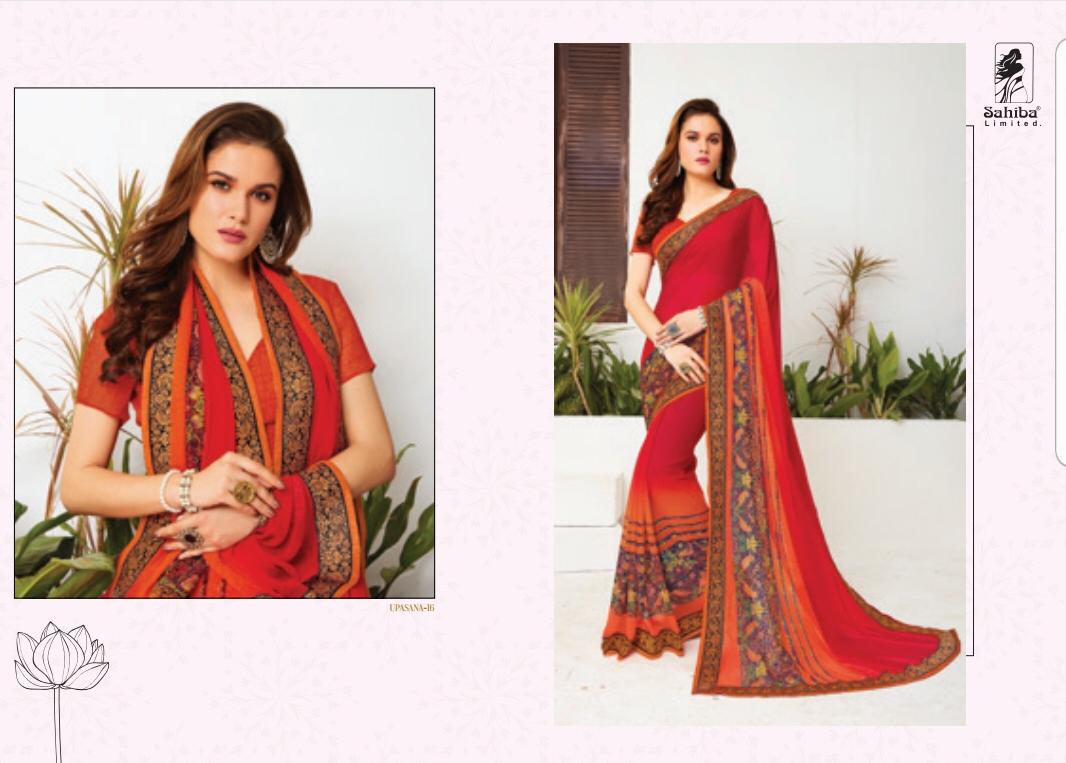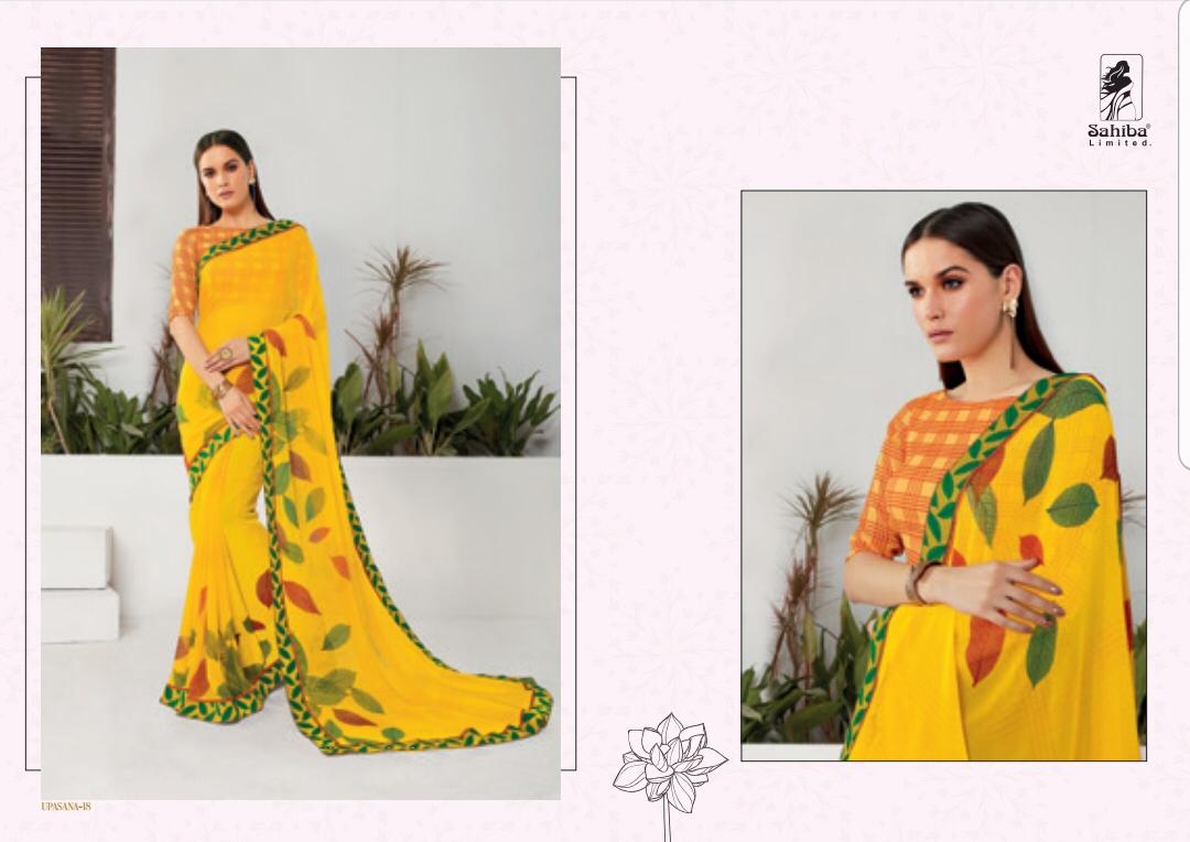 Buy Online Upsana By Sahiba 09 Series Fancy Georgette Printed Saree Collection Wholesaler Surat 18 Pcs of Full Catalogue at Wholesale Price. Looking for Upsana By Sahiba 09 Series Fancy Georgette Printed Saree Collection Wholesaler Surat Full Catalouge at Best Price? Buy Now Upsana By Sahiba 09 Series Fancy Georgette Printed Saree Collection Wholesaler Surat at Wholesale Rate of Rs 12150 with Total 18 Pcs from authroized dealer and supplier of SAHIBA Brand. Cost of Each piece is just only Rs 675 which is very low and affordable price to resale the product in your retail store ,This is Surat based Wholesale Supplier & Dealer of SAHIBA Brand. Click on Brand name to Know more about SAHIBA Brand's products.Call or Whatsapp on 9898838984 for booking or enquiry