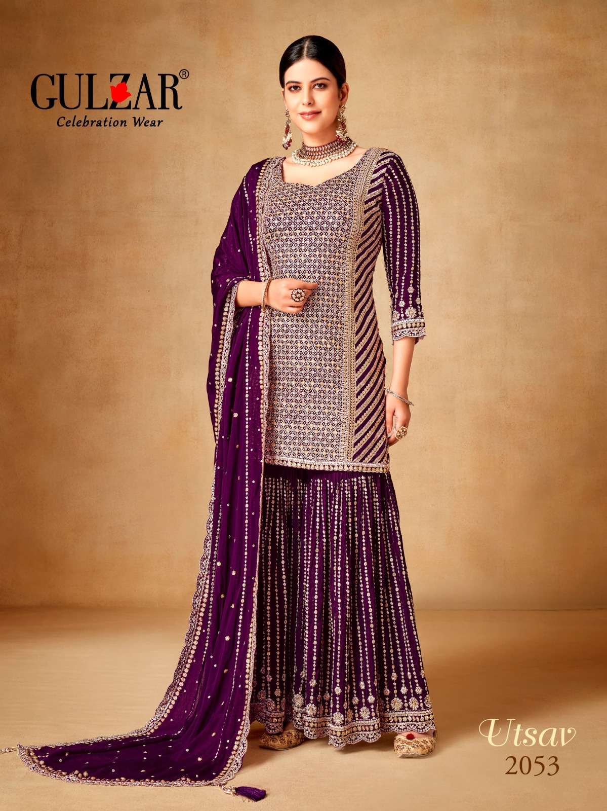 Buy Online Utsav D No 2051 2054 by Gulzar Chinnon suit collection manufacturer surat 4 Pcs of Full Catalogue at Wholesale Price. Looking for Utsav D No 2051 2054 by Gulzar Chinnon suit collection manufacturer surat Full Catalouge at Best Price? Buy Now Utsav D No 2051 2054 by Gulzar Chinnon suit collection manufacturer surat at Wholesale Rate of Rs 9580 with Total 4 Pcs from authroized dealer and supplier of GULZAR Brand. Cost of Each piece is just only Rs 2395 which is very low and affordable price to resale the product in your retail store ,This is Surat based Wholesale Supplier & Dealer of GULZAR Brand. Click on Brand name to Know more about GULZAR Brand's products.Call or Whatsapp on 9898838984 for booking or enquiry