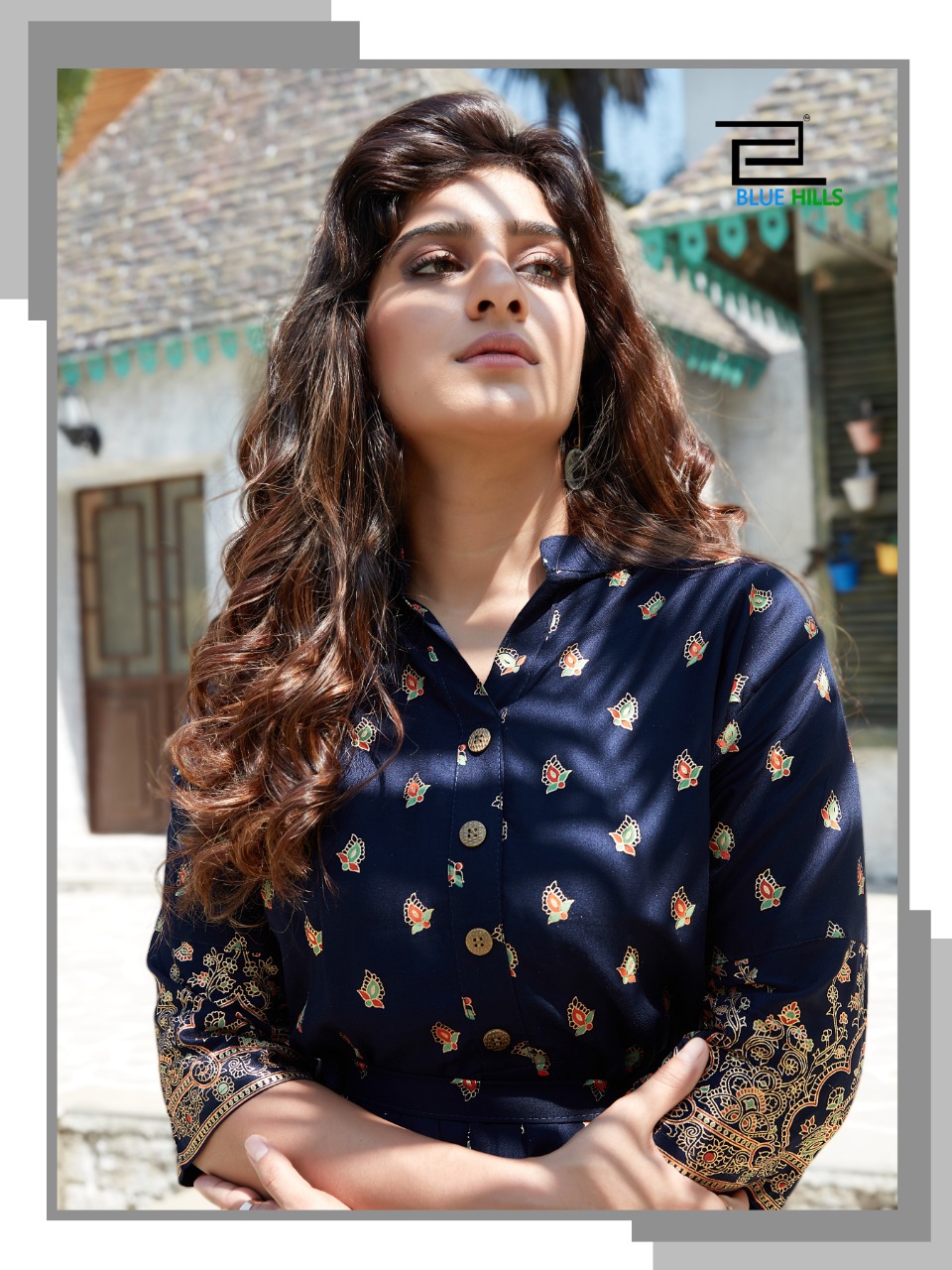 V desi by Blue hills vf surat wholesalers New Catlog by *BLUE HILLS* Catalogue name - *V-DESI* Fabric : 14KG REYON Concept:-Long Gown with Foil Print Length:- 50+" 6 piece BAG Size :M L XL XXL 3XL 515 + gst Set to set Dispatch Saturday |