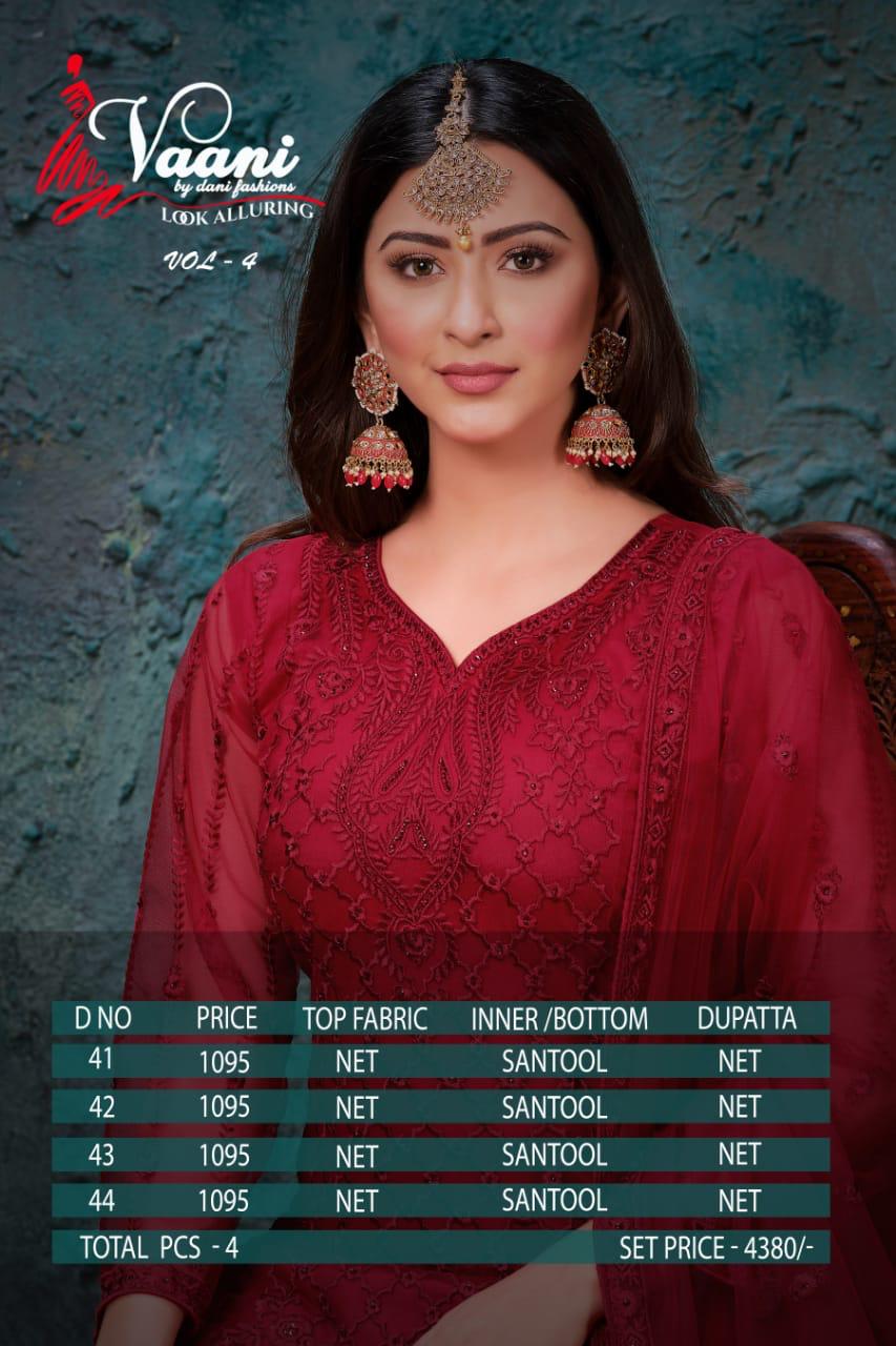 Dear Sir, We Are Launching Our New Series ?*New Arrival Vaani Vol-4 ? ?Top. Â? Net With Heavy Tone to Tone Thread & Stone Work ?Bottom- Santool ?? Dupatta Â?Net with Heavy Tone To Tone Thread & Stone Work Price :- 1095/- Rs Set & loose & Singel Dispatch from 23/01/2021 GST 5 Percent Extra 100+single |