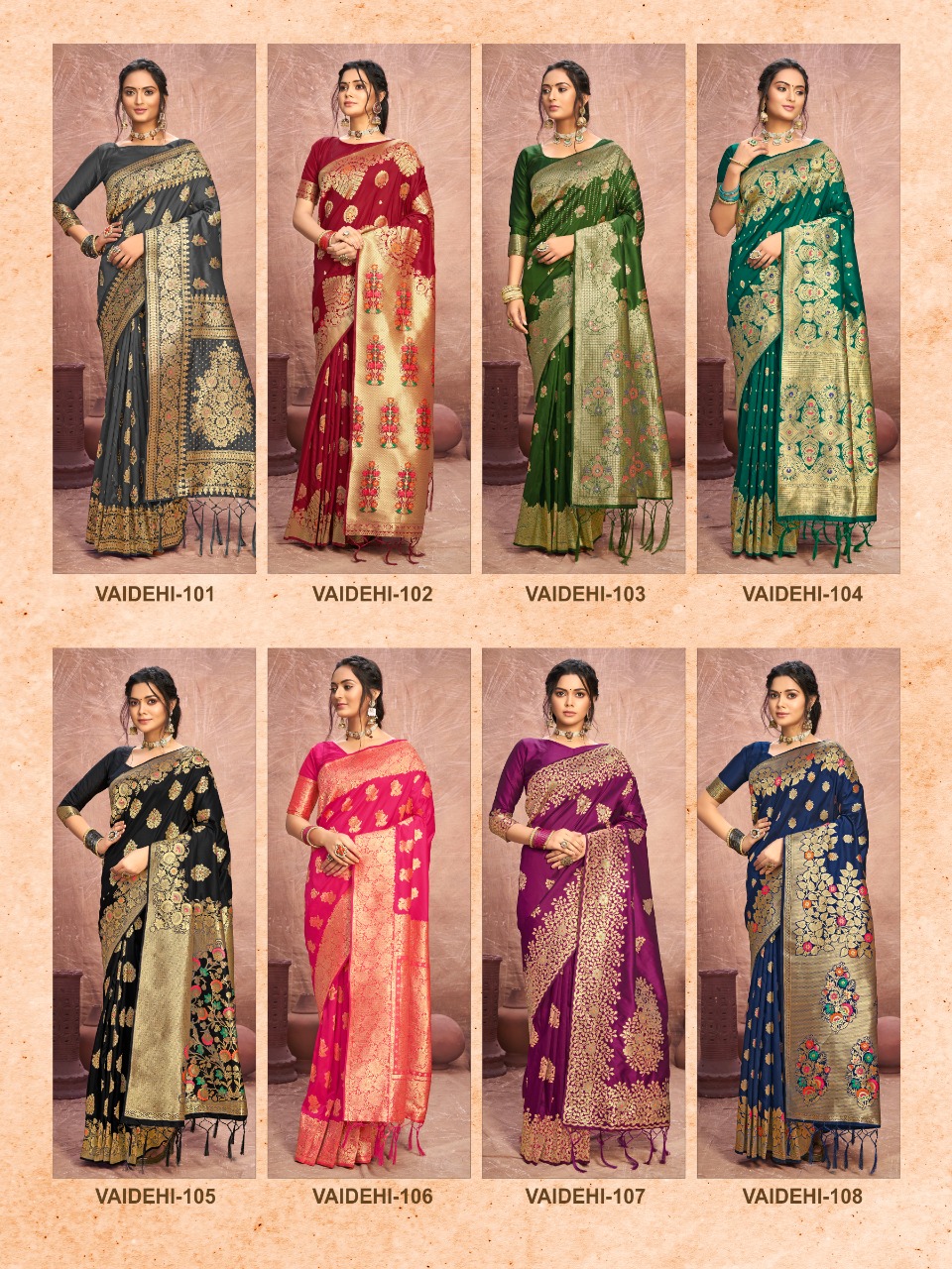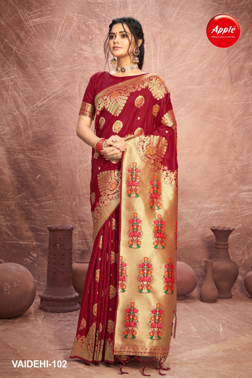 Brand - Apple . *LAUNCH TODAY* *CATALOG NAME : VAIDEHI (VOL 1)* *DESIGN : 8* *FABRIC : 50-50 SMART SILK (PURE ZARI WEAVING)* *Rate : 995/-* *NOTE : WITH BOX COMBO RATE* Set to set. Delivery 2 days |