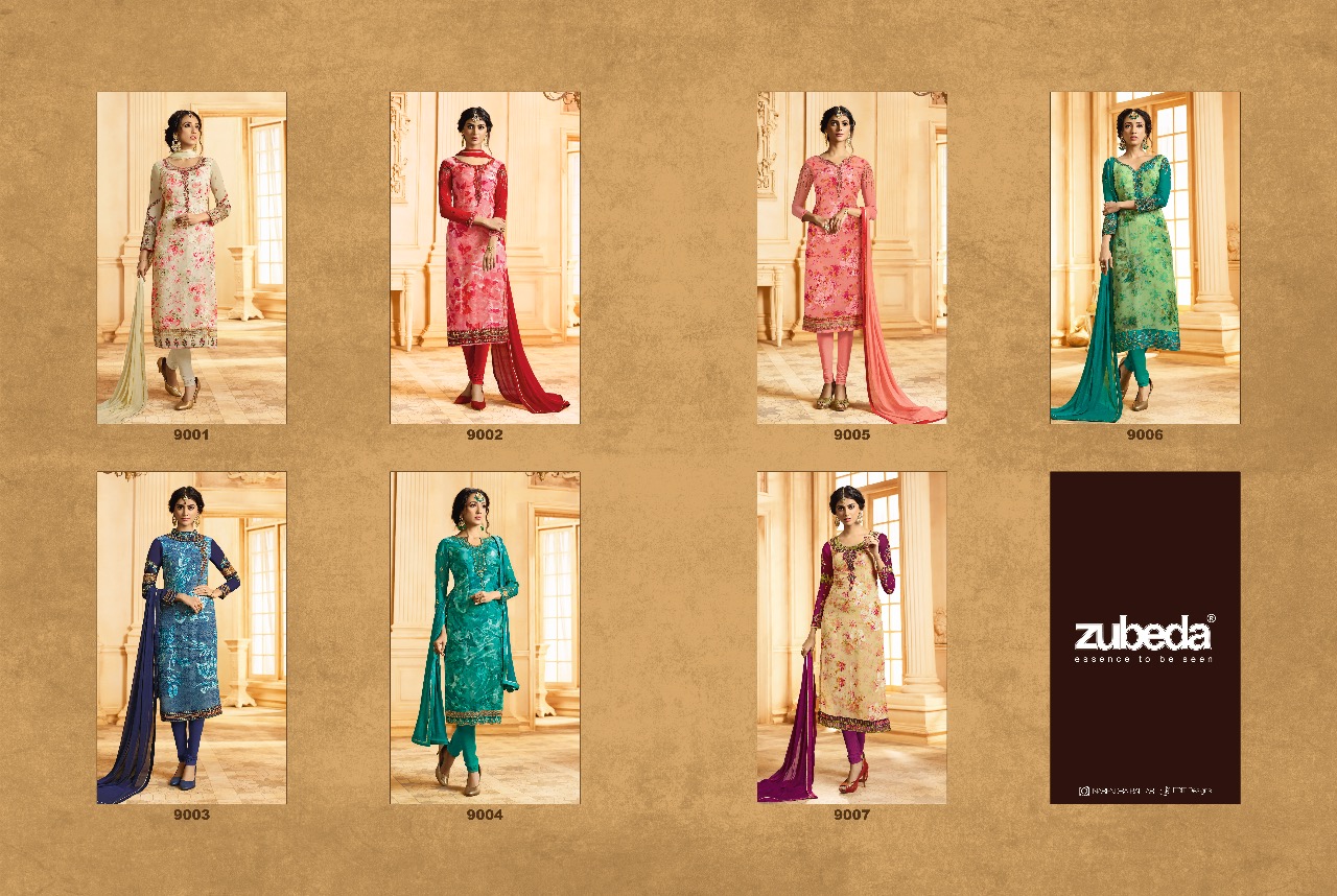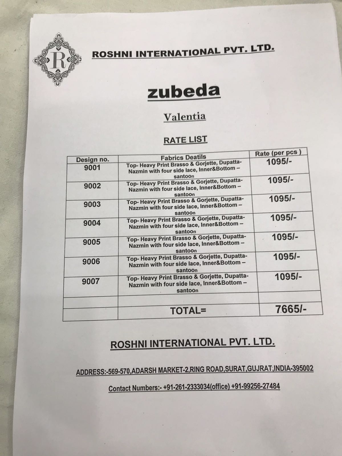 Buy Online Valentia By Zubeda 9001 Series Fancy Brasso Printed Salwar Kameez Catlog Wholesale Dealer And Supplier Surat 7 Pcs of Full Catalogue at Wholesale Price. Looking for Valentia By Zubeda 9001 Series Fancy Brasso Printed Salwar Kameez Catlog Wholesale Dealer And Supplier Surat Full Catalouge at Best Price? Buy Now Valentia By Zubeda 9001 Series Fancy Brasso Printed Salwar Kameez Catlog Wholesale Dealer And Supplier Surat at Wholesale Rate of Rs 7665 with Total 7 Pcs from authroized dealer and supplier of ZUBEDA Brand. Cost of Each piece is just only Rs 1095 which is very low and affordable price to resale the product in your retail store ,This is Surat based Wholesale Supplier & Dealer of ZUBEDA Brand. Click on Brand name to Know more about ZUBEDA Brand's products.Call or Whatsapp on 9898838984 for booking or enquiry