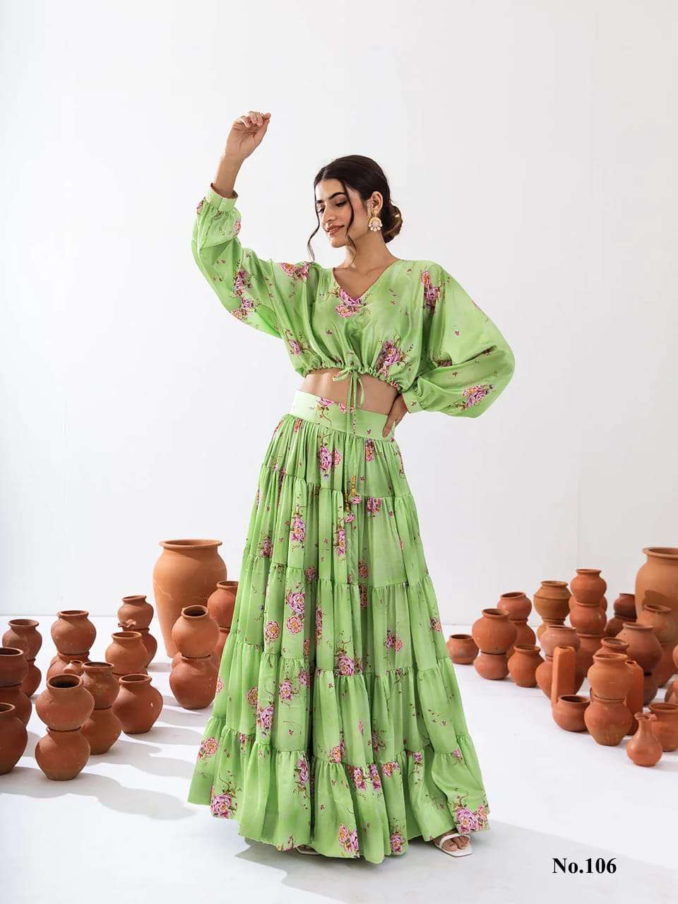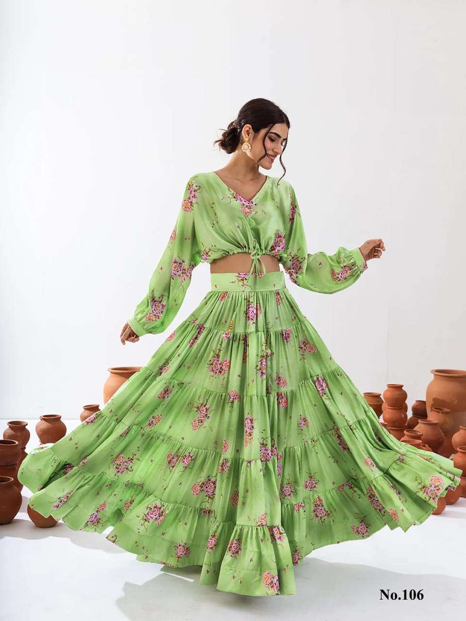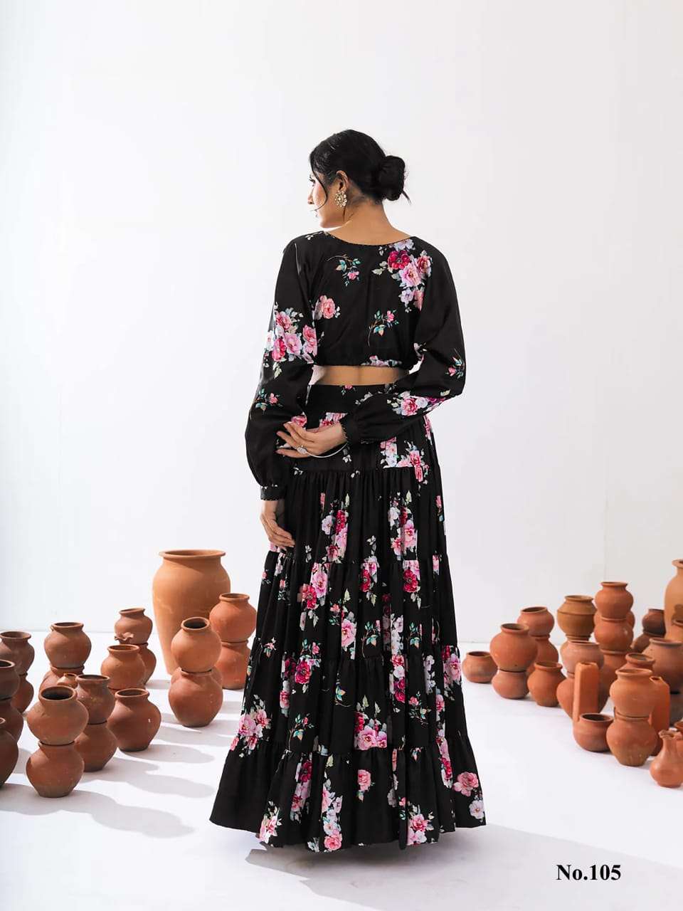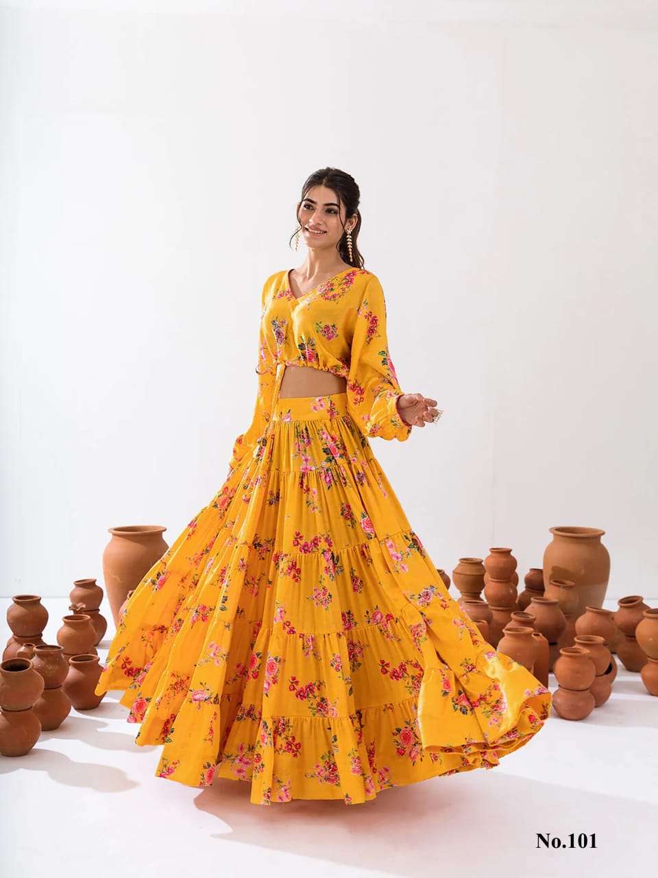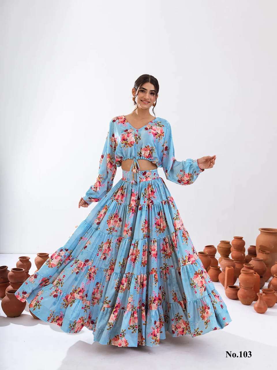 Introducing this stunning 2-piece floral printed tier lahenga with crop top collection (set of 7 beautiful design 107 to 107)