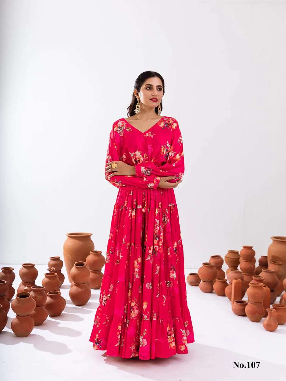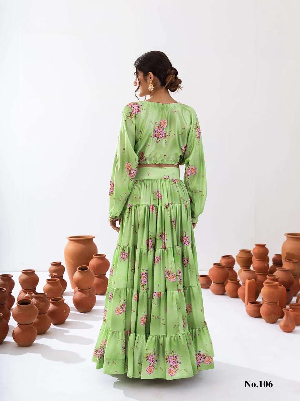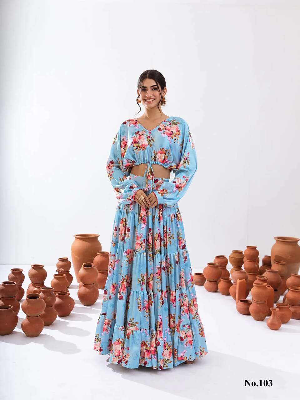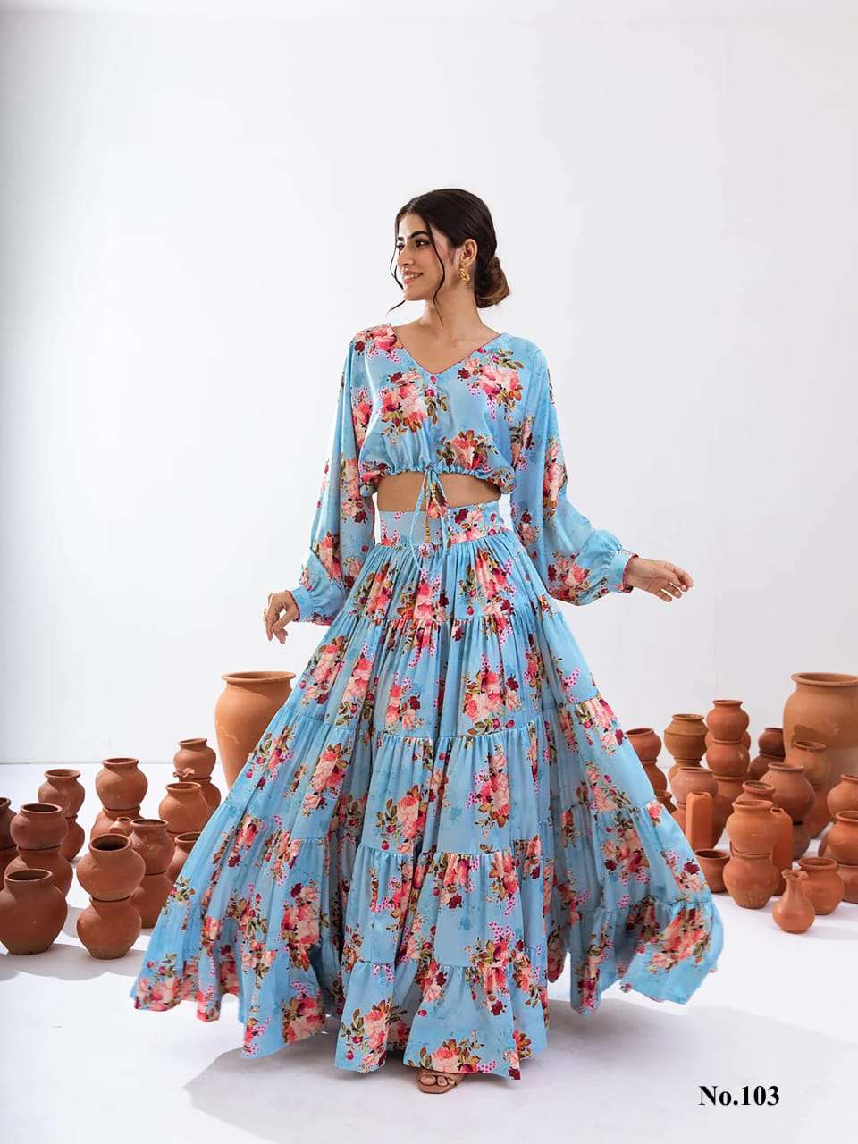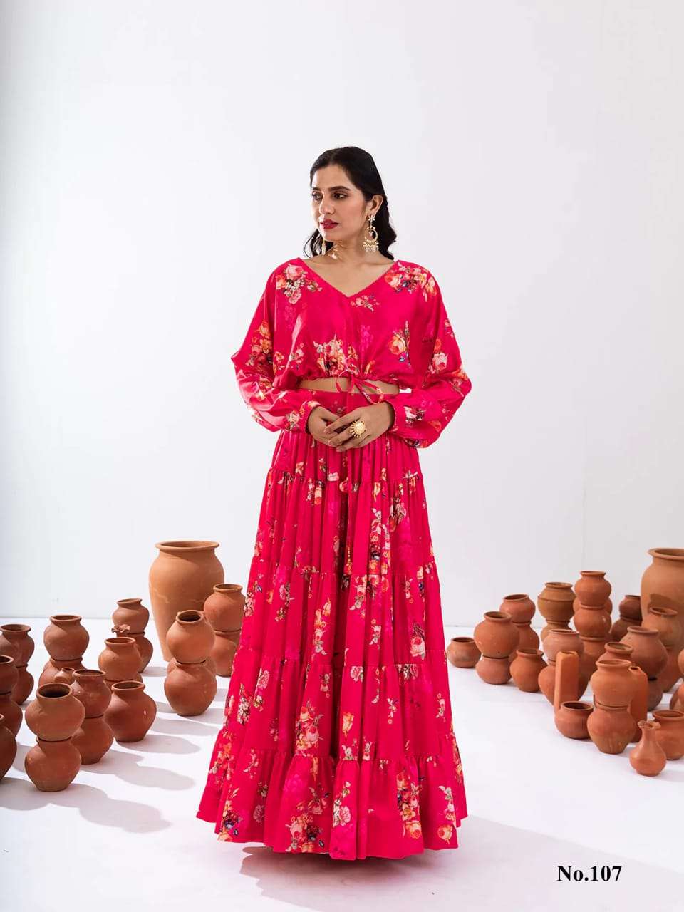 Introducing this stunning 2-piece floral printed tier lahenga with crop top collection (set of 7 beautiful design 107 to 107)