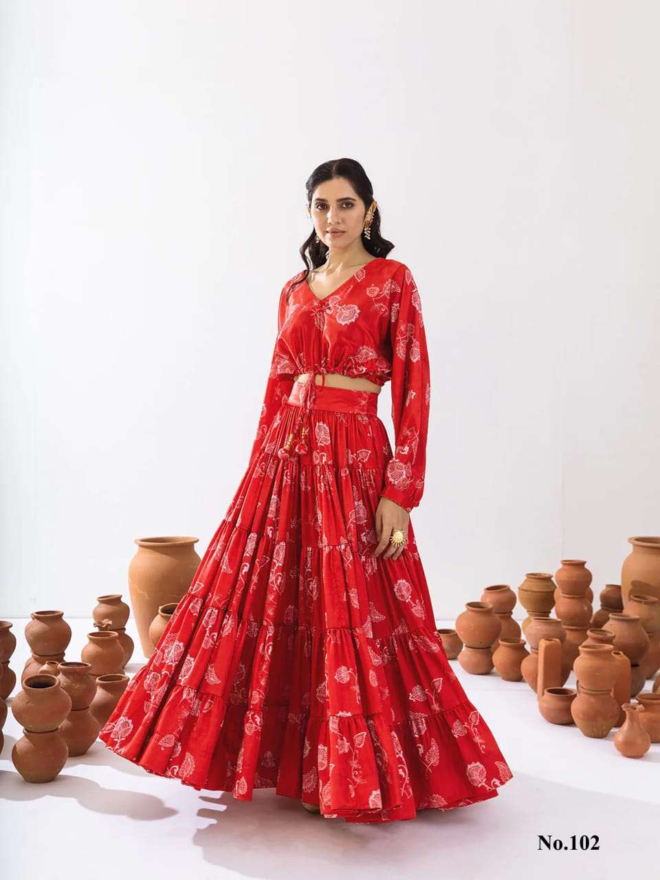 Style:- 2 piece Attractive Floral printed tier skirt with full flair paired with waist adjustable crop top enhanced with matching beautiful latkan