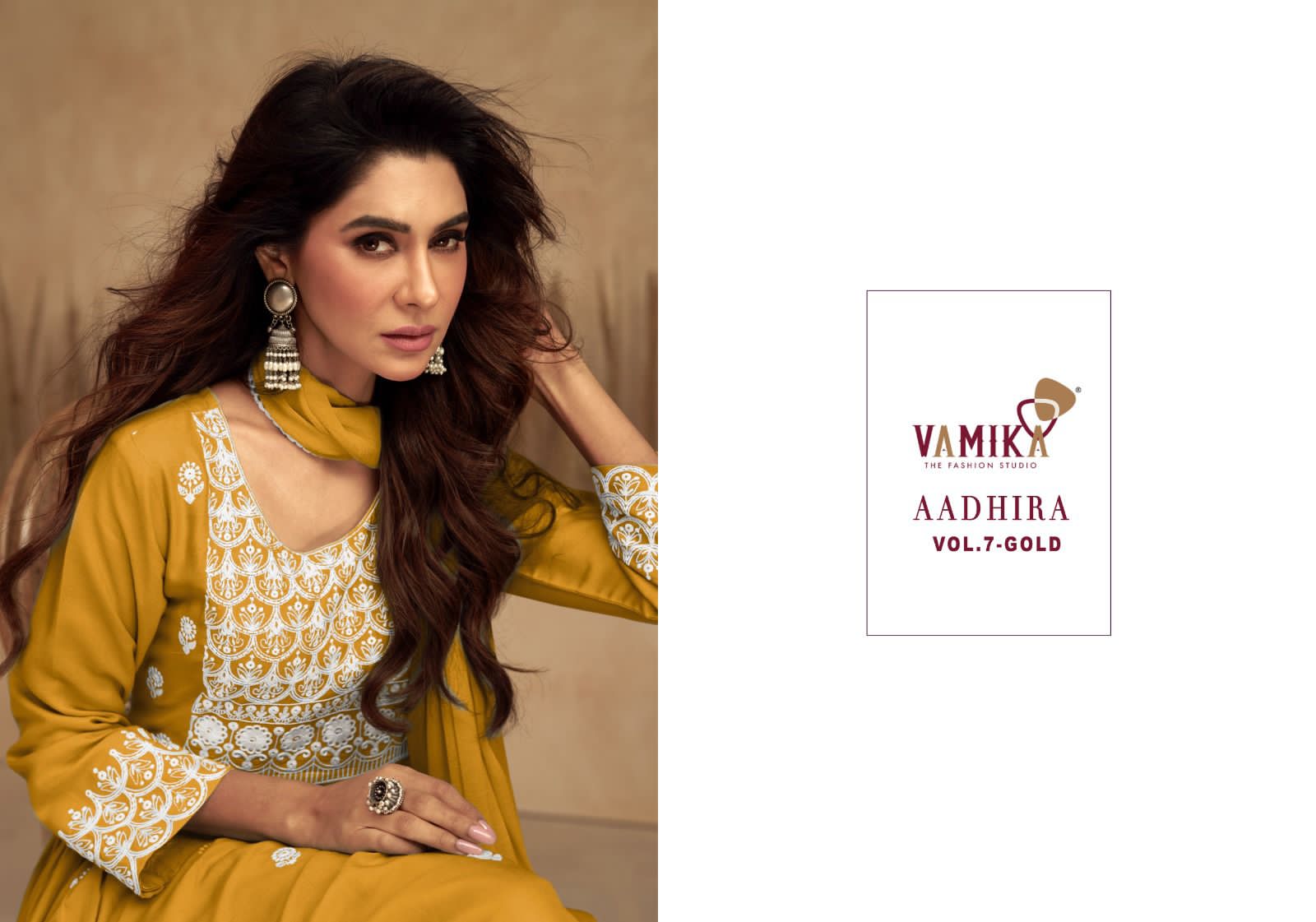Vamika New Catalog Aadhira Vol 7 Gold Fancy Top Bottom Duppata Collection