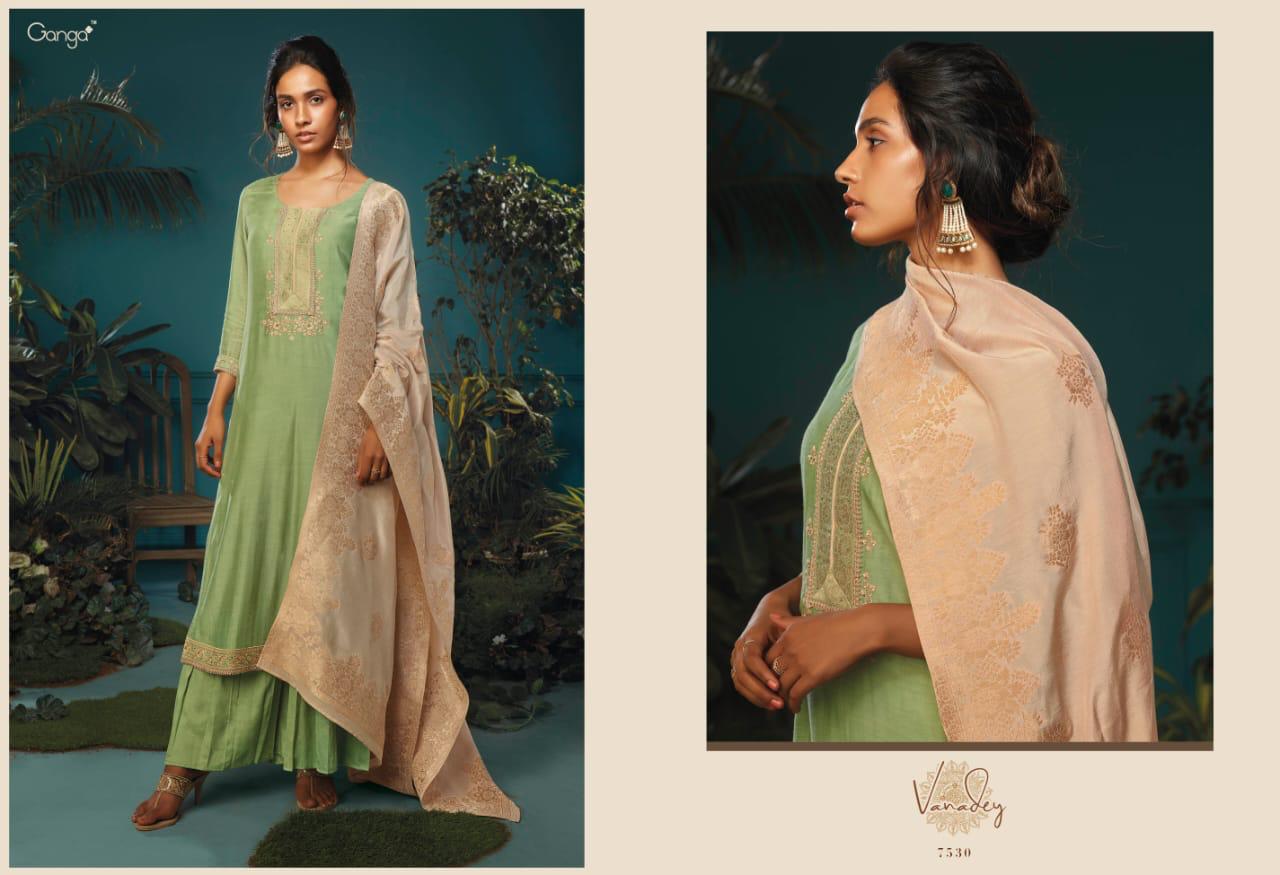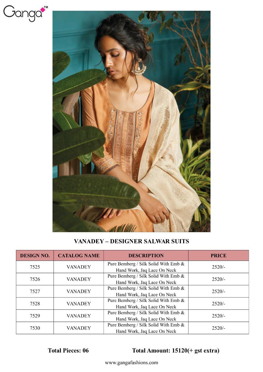 Buy Online Vanadey By Ganga Series 7525 To 7530 Bemberg Embroidered Designer Party Wear Suits Wholesale Supplier Gujarat 6 Pcs of Full Catalogue at Wholesale Price. Looking for Vanadey By Ganga Series 7525 To 7530 Bemberg Embroidered Designer Party Wear Suits Wholesale Supplier Gujarat Full Catalouge at Best Price? Buy Now Vanadey By Ganga Series 7525 To 7530 Bemberg Embroidered Designer Party Wear Suits Wholesale Supplier Gujarat at Wholesale Rate of Rs 15120 with Total 6 Pcs from authroized dealer and supplier of GANGA Brand. Cost of Each piece is just only Rs 2520 which is very low and affordable price to resale the product in your retail store ,This is Surat based Wholesale Supplier & Dealer of GANGA Brand. Click on Brand name to Know more about GANGA Brand's products.Call or Whatsapp on 9898838984 for booking or enquiry