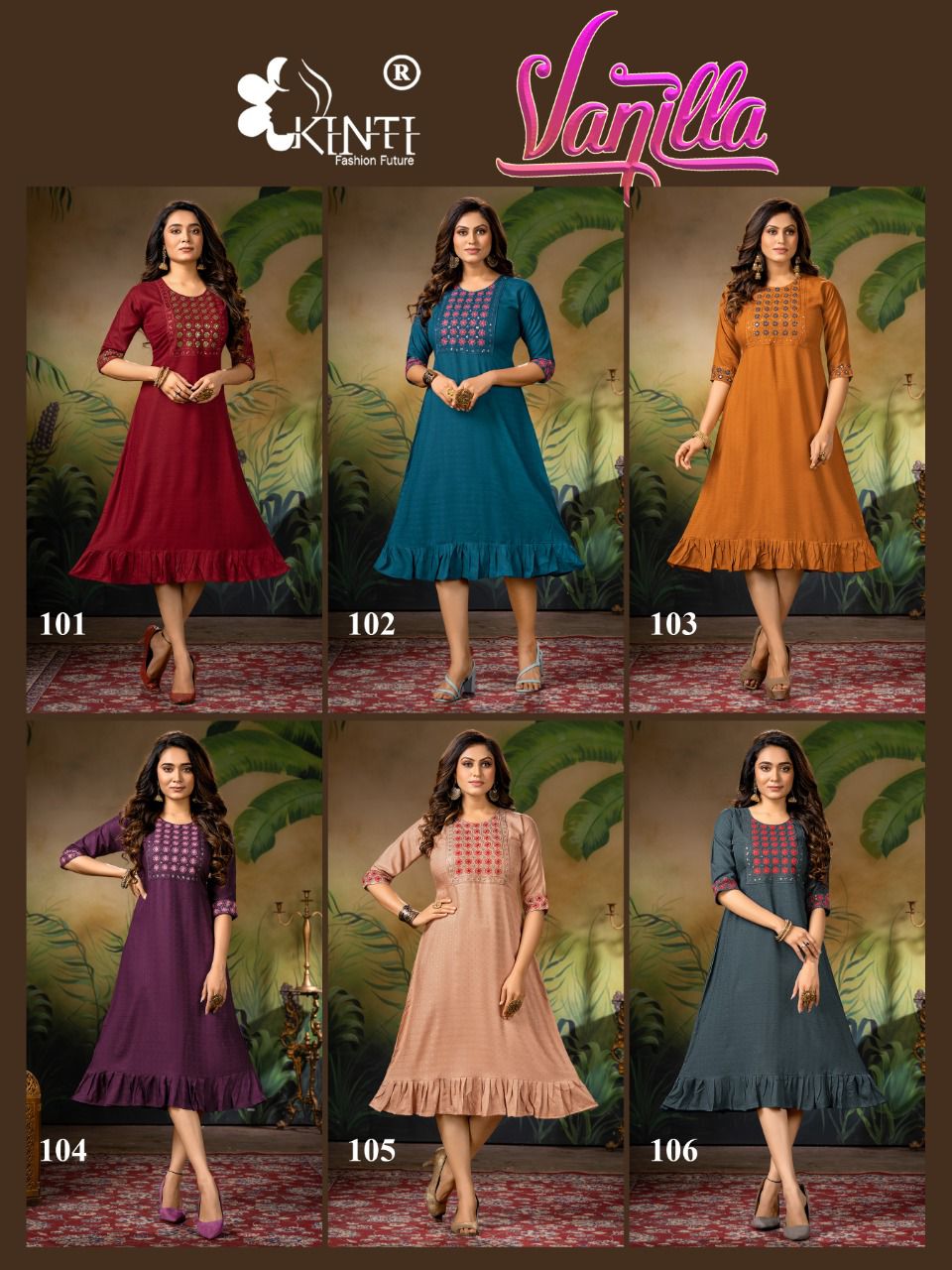 *Vanilla By *Kinti* ®? Fabric. : *Fancy Rayon Fabric* Style. : *Embroidery and Sleeve work* Sleeves. : *3/4th sleeves* Length. : *45* Sizes : *M L XL XXL 3Xl* Colors : *6* 449/- |