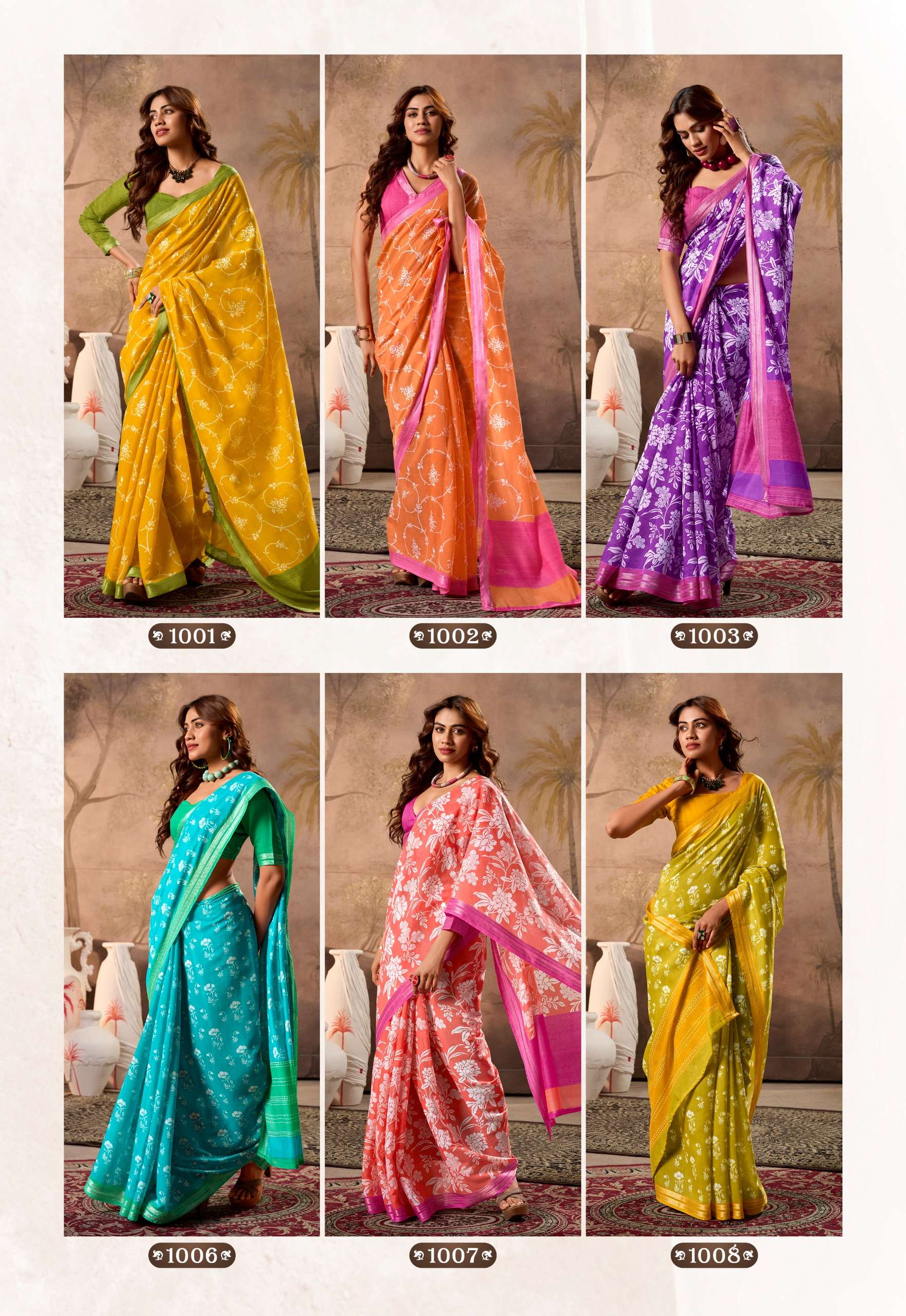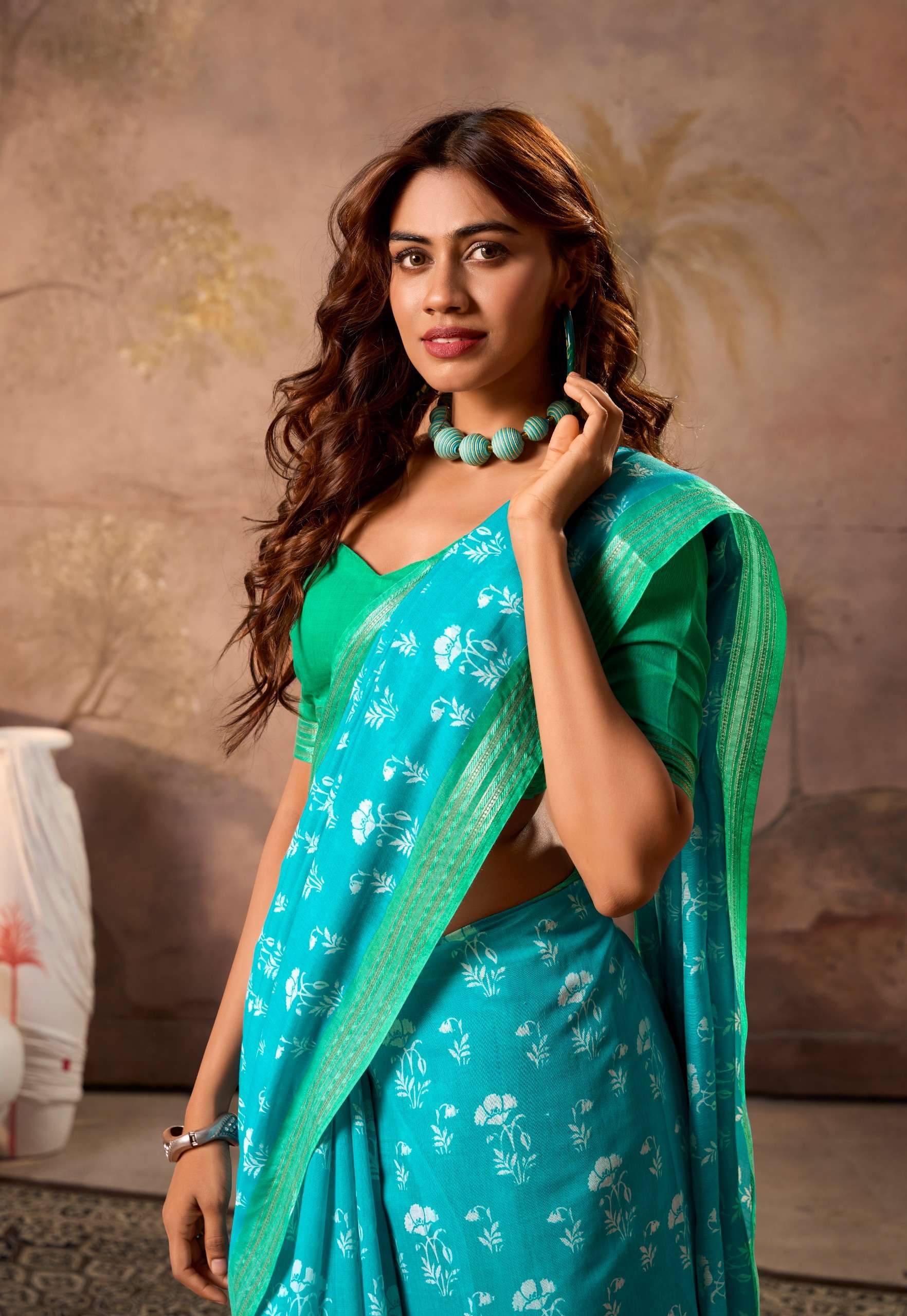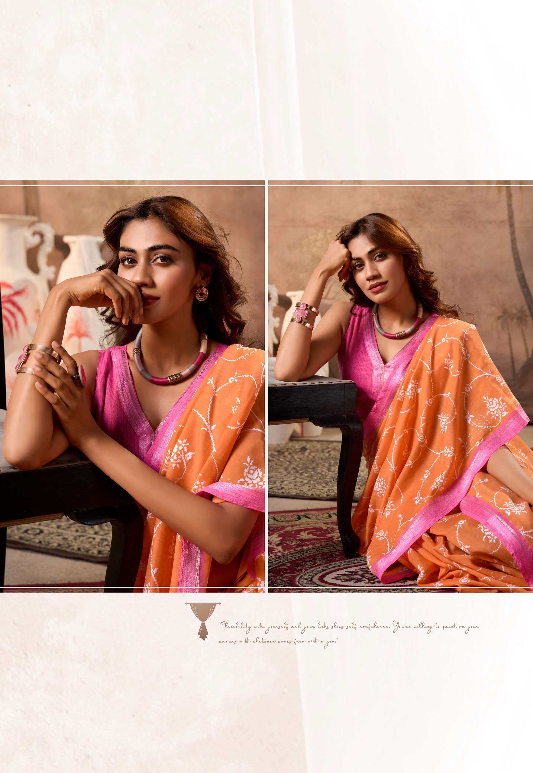 ➡️Catalog - *Vanya* ➡️Fabric - *Mul Cotton with Beautiful Print & Contrast Zari border & Blouse*