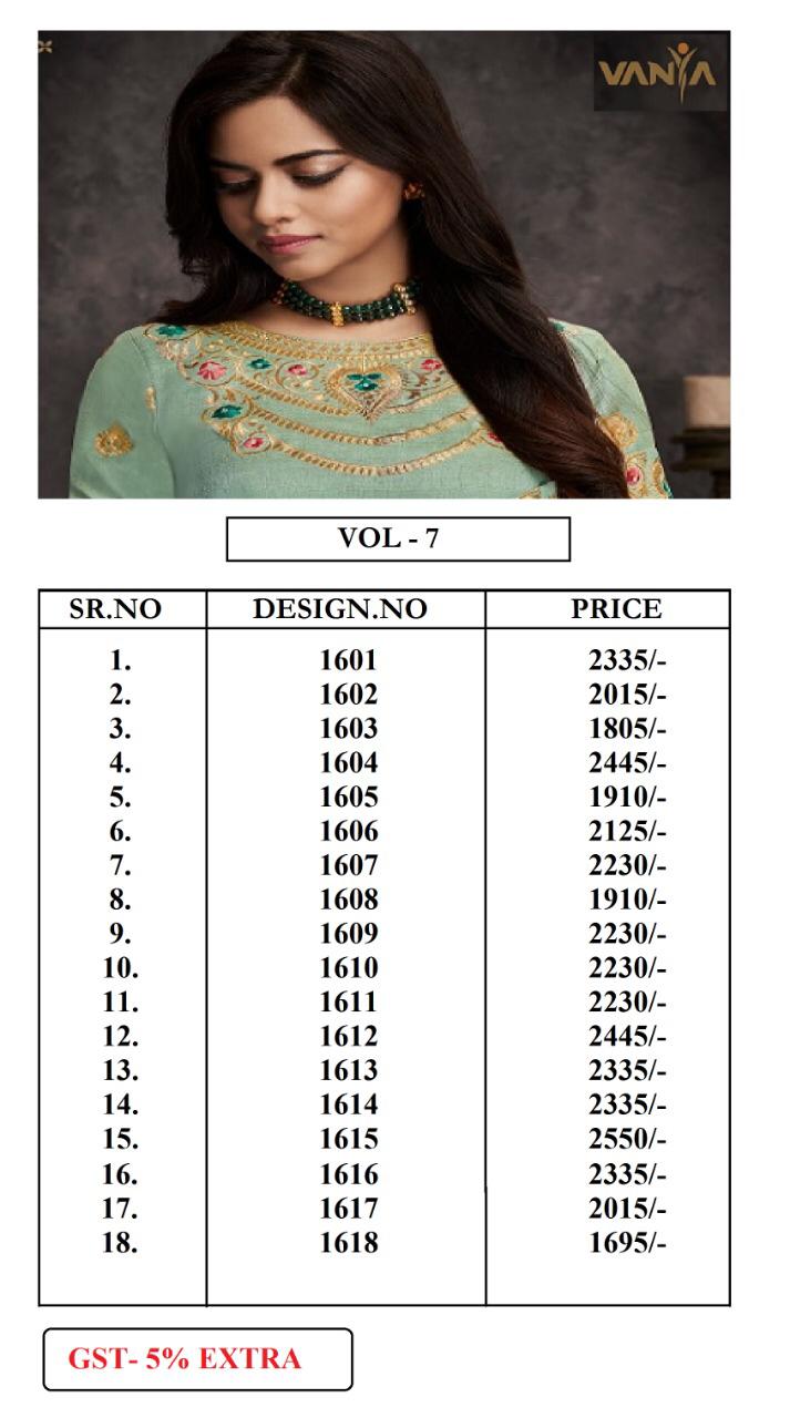 Buy Online Vanya Vol 7 By Vanya 1601 Series Designer Party Wear Saree Catlog Wholesale Dealer Surat 18 Pcs of Full Catalogue at Wholesale Price. Looking for Vanya Vol 7 By Vanya 1601 Series Designer Party Wear Saree Catlog Wholesale Dealer Surat Full Catalouge at Best Price? Buy Now Vanya Vol 7 By Vanya 1601 Series Designer Party Wear Saree Catlog Wholesale Dealer Surat at Wholesale Rate of Rs 0 with Total 18 Pcs from authroized dealer and supplier of VANYA Brand. Cost of Each piece is just only Rs 0 which is very low and affordable price to resale the product in your retail store ,This is Surat based Wholesale Supplier & Dealer of VANYA Brand. Click on Brand name to Know more about VANYA Brand's products.Call or Whatsapp on 9898838984 for booking or enquiry