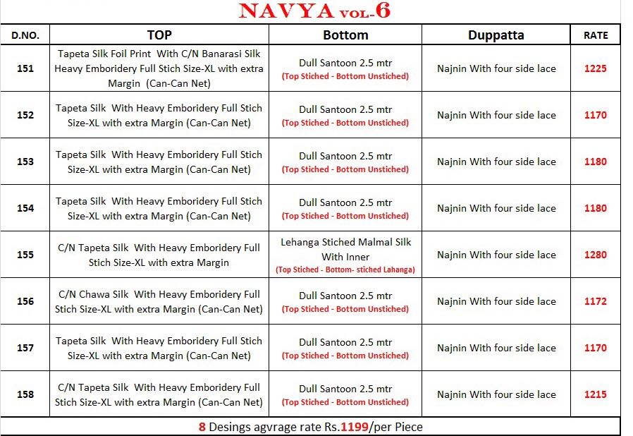 Dear Customer, We are launching our new Suit Catalog Brand-Vardan Designer Catalog-Navya Vol-6 Series-151 to 158 Thanks for your love? and support Presenting our new catalogue Navya Vol-6 Fabric Detail? Top: Tapeta Silk and C/N Silk with inner Stitched size -XL with Extra Margin Can-Can Net Bottom: Verity (Details in Image) Dupatta: Najmin four side lace GST 5 Percent Extra * Designs: 8 Dispatching- 10 April FOR SINGLES PRICE CALL OR WHATSAPP ON +91-9898838984 |