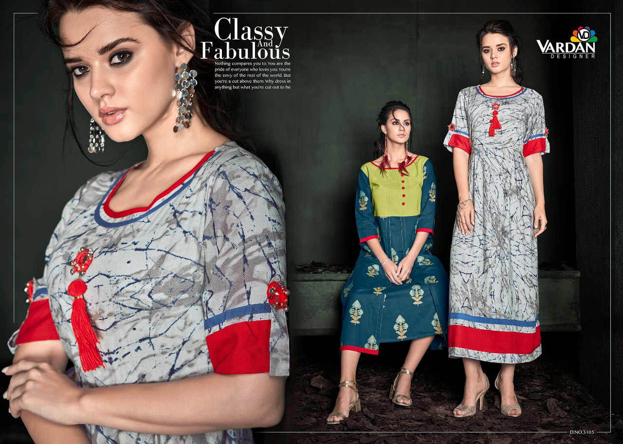 Buy Online Vardan Pakiza Vol 1 Fancy Reyon Print Kurti Dealer Surat 8 Pcs of Full Catalogue at Wholesale Price. Looking for Vardan Pakiza Vol 1 Fancy Reyon Print Kurti Dealer Surat Full Catalouge at Best Price? Buy Now Vardan Pakiza Vol 1 Fancy Reyon Print Kurti Dealer Surat at Wholesale Rate of Rs 5200 with Total 8 Pcs from authroized dealer and supplier of VARDAN DESIGNER Brand. Cost of Each piece is just only Rs 650 which is very low and affordable price to resale the product in your retail store ,This is Surat based Wholesale Supplier & Dealer of VARDAN DESIGNER Brand. Click on Brand name to Know more about VARDAN DESIGNER Brand's products.Call or Whatsapp on 9898838984 for booking or enquiry