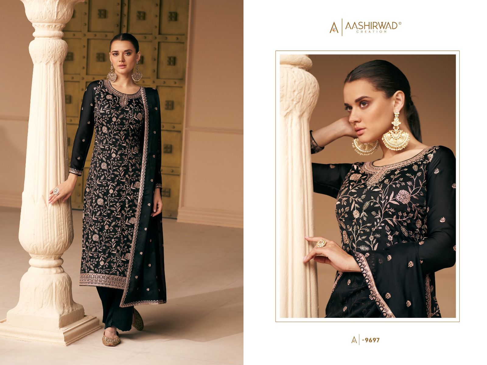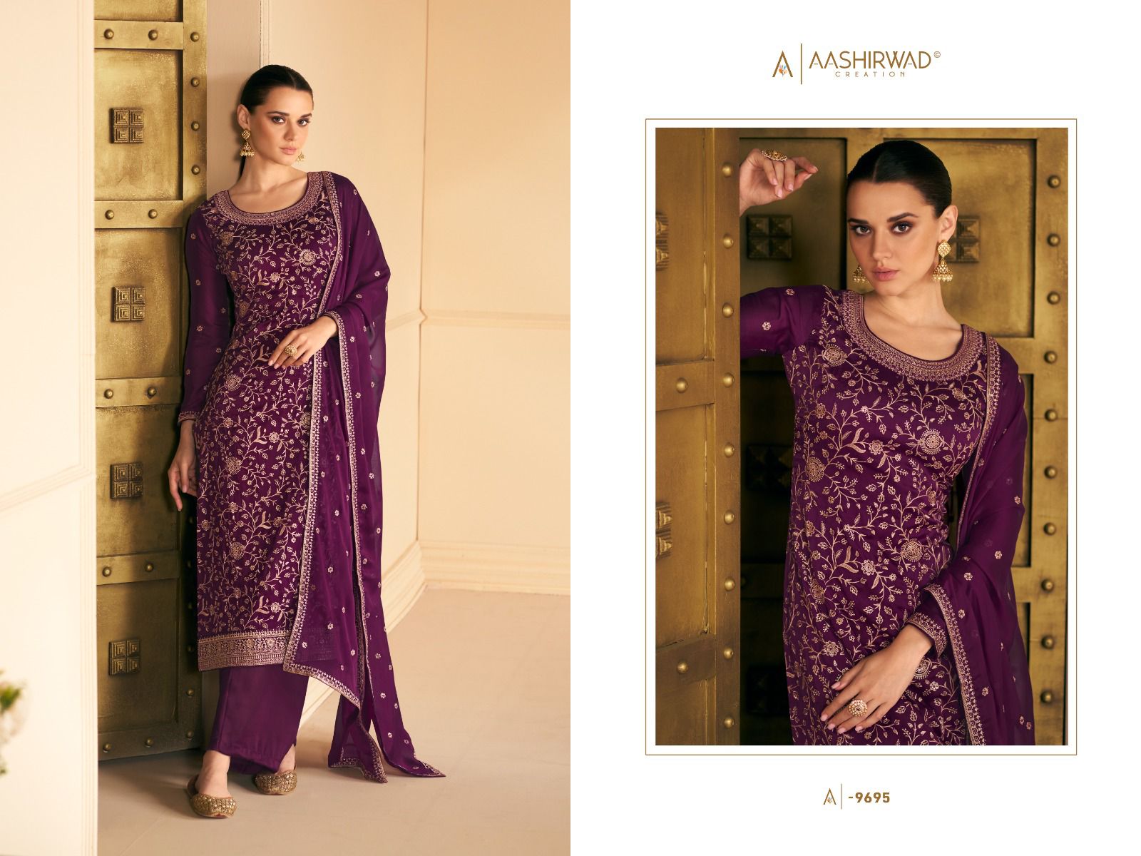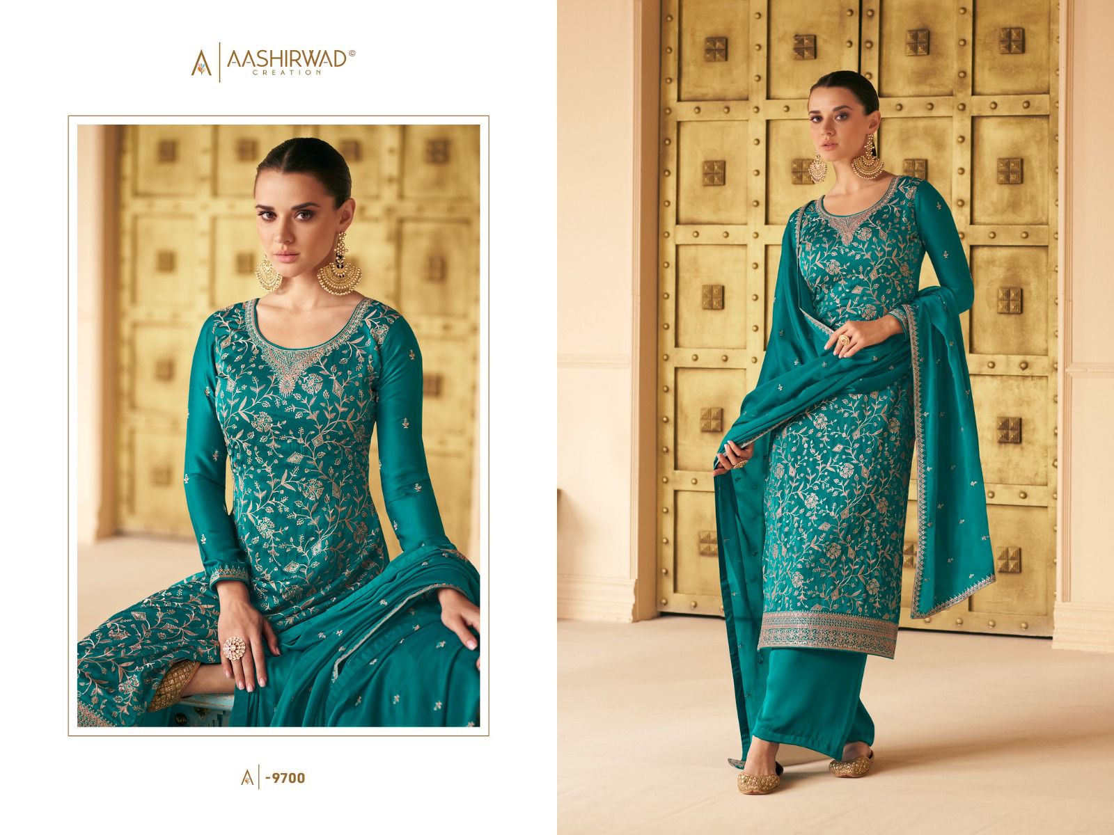 *VARINA (AASHIRWAD)* *FABRIC DETAILS* TOP :- SOFT SILK SATIN WITH SILK SANTOON INNER BOTTOM :- SOFT SILK SATIN DUPATTA :- RANGOLI GEORGETTE TYPE :- UN-STITCH *PRICE :- 2000/-* *GST :- 5%* 100+single |