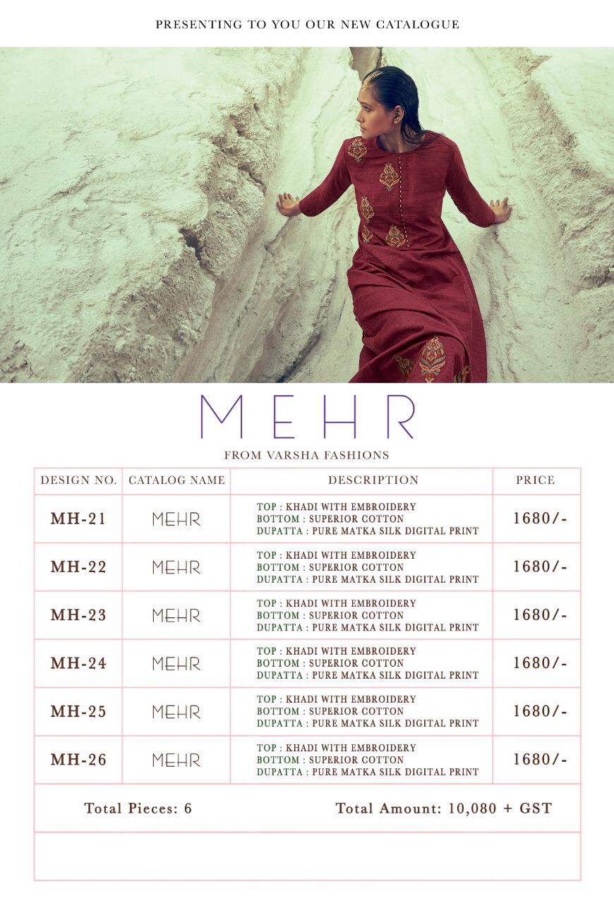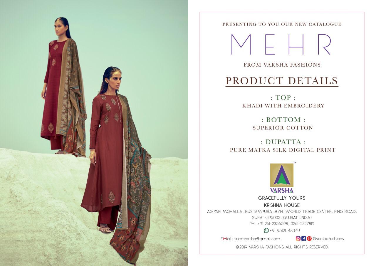 Buy Online Varsha Meher Khadi With Embroidery Designer Party Wear Suits Wholesale Supplier Gujarat 6 Pcs of Full Catalogue at Wholesale Price. Looking for Varsha Meher Khadi With Embroidery Designer Party Wear Suits Wholesale Supplier Gujarat Full Catalouge at Best Price? Buy Now Varsha Meher Khadi With Embroidery Designer Party Wear Suits Wholesale Supplier Gujarat at Wholesale Rate of Rs 10080 with Total 6 Pcs from authroized dealer and supplier of Brand. Cost of Each piece is just only Rs 1680 which is very low and affordable price to resale the product in your retail store ,This is Surat based Wholesale Supplier & Dealer of Brand. Click on Brand name to Know more about Brand's products.Call or Whatsapp on 9898838984 for booking or enquiry