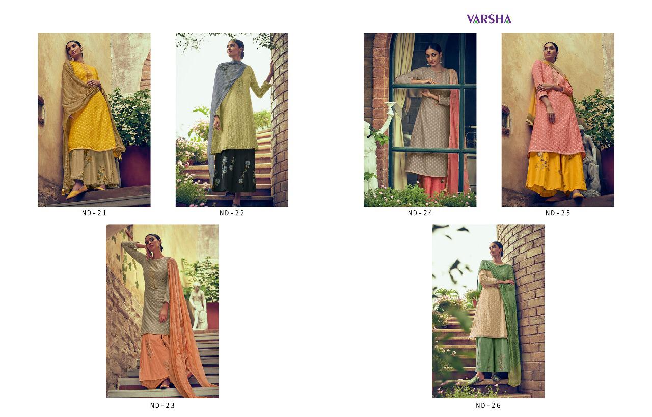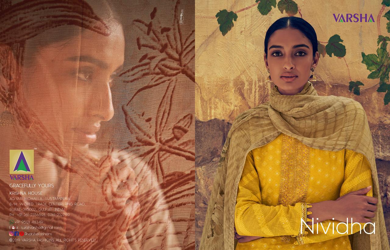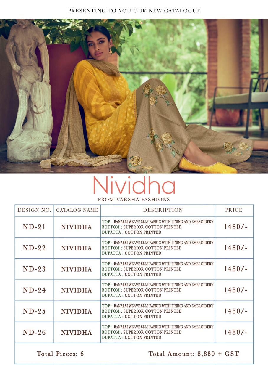 Buy Online Varsha Nividha Banarasi Weave Designer Party Wear Suits Wholesale Supplier Nd Dealer Gujarat 6 Pcs of Full Catalogue at Wholesale Price. Looking for Varsha Nividha Banarasi Weave Designer Party Wear Suits Wholesale Supplier Nd Dealer Gujarat Full Catalouge at Best Price? Buy Now Varsha Nividha Banarasi Weave Designer Party Wear Suits Wholesale Supplier Nd Dealer Gujarat at Wholesale Rate of Rs 9840 with Total 6 Pcs from authroized dealer and supplier of Brand. Cost of Each piece is just only Rs 1640 which is very low and affordable price to resale the product in your retail store ,This is Surat based Wholesale Supplier & Dealer of Brand. Click on Brand name to Know more about Brand's products.Call or Whatsapp on 9898838984 for booking or enquiry
