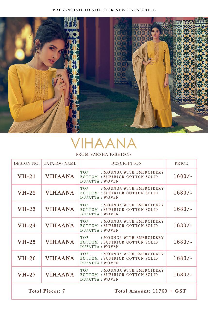 Buy Online Varsha Vihaana Designer Suits Wholesale Supplier Gujarat 7 Pcs of Full Catalogue at Wholesale Price. Looking for Varsha Vihaana Designer Suits Wholesale Supplier Gujarat Full Catalouge at Best Price? Buy Now Varsha Vihaana Designer Suits Wholesale Supplier Gujarat at Wholesale Rate of Rs 11760 with Total 7 Pcs from authroized dealer and supplier of Brand. Cost of Each piece is just only Rs 1680 which is very low and affordable price to resale the product in your retail store ,This is Surat based Wholesale Supplier & Dealer of Brand. Click on Brand name to Know more about Brand's products.Call or Whatsapp on 9898838984 for booking or enquiry
