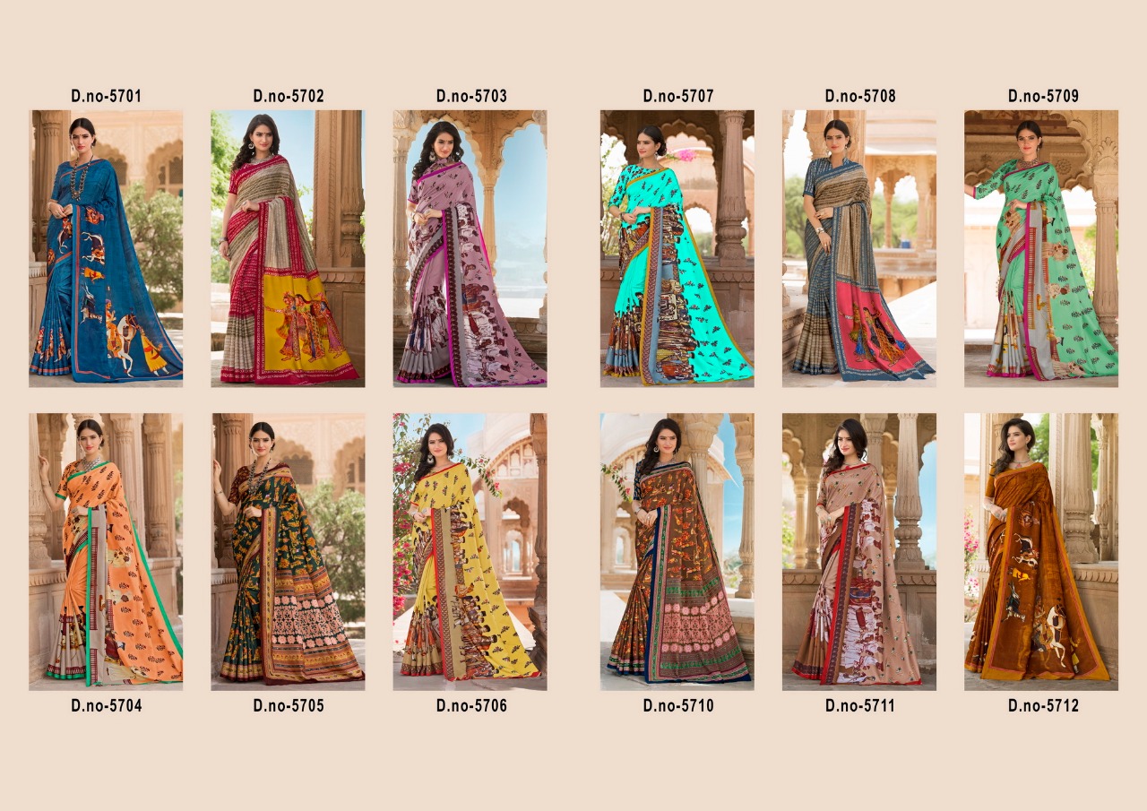 Buy Online Varsiddhi Mintorsi Royal Elegance 5701 Series Saree 12 Pcs of Full Catalogue at Wholesale Price. Looking for Varsiddhi Mintorsi Royal Elegance 5701 Series Saree Full Catalouge at Best Price? Buy Now Varsiddhi Mintorsi Royal Elegance 5701 Series Saree at Wholesale Rate of Rs 7740 with Total 12 Pcs from authroized dealer and supplier of VARSIDDHI SAREE Brand. Cost of Each piece is just only Rs 645 which is very low and affordable price to resale the product in your retail store ,This is Surat based Wholesale Supplier & Dealer of VARSIDDHI SAREE Brand. Click on Brand name to Know more about VARSIDDHI SAREE Brand's products.Call or Whatsapp on 9898838984 for booking or enquiry