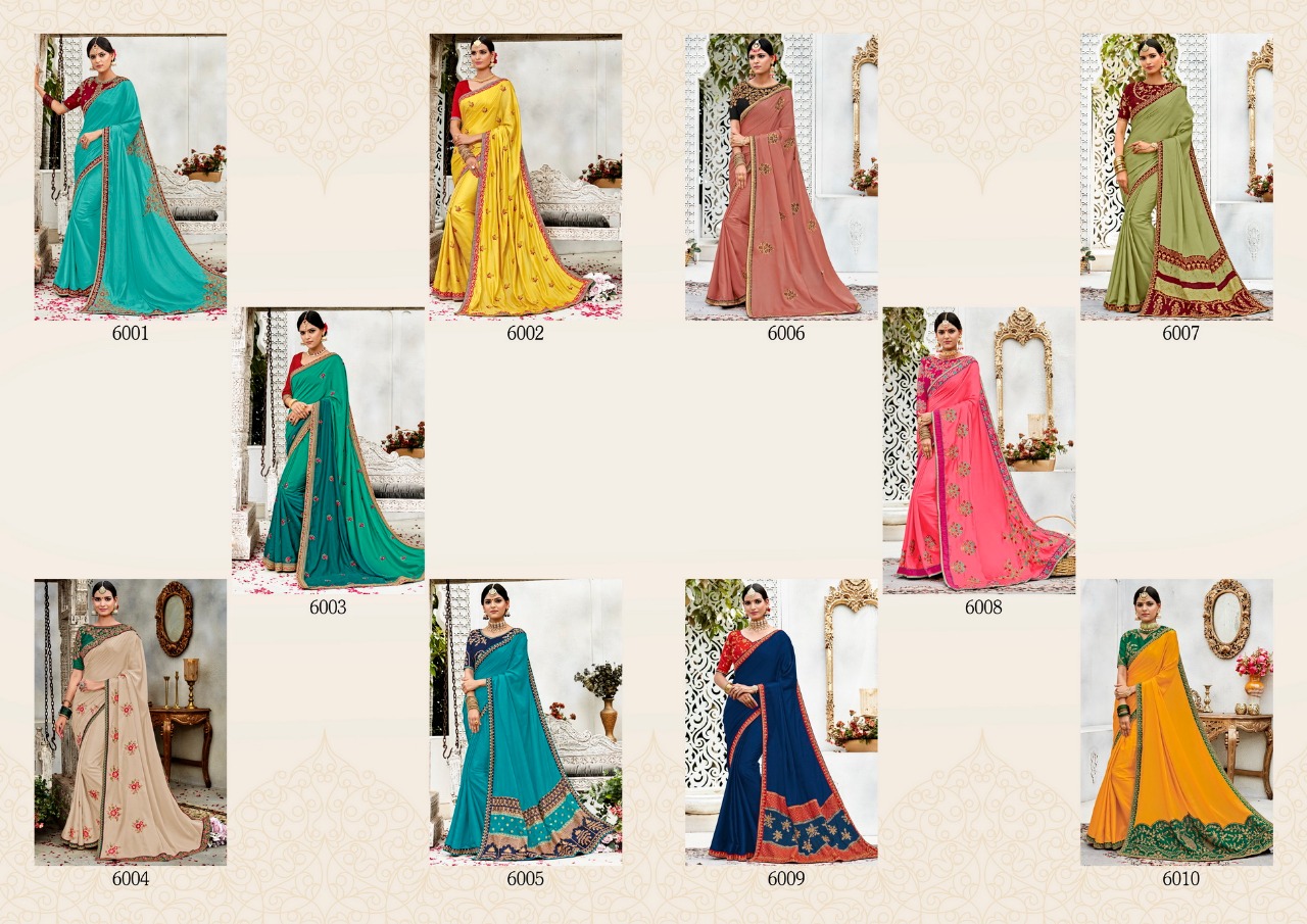 Buy Online Varsiddhi Mintorsi Virasat 6001 Series Designer Saree Catlog Wholesale Dealer Surat 10 Pcs of Full Catalogue at Wholesale Price. Looking for Varsiddhi Mintorsi Virasat 6001 Series Designer Saree Catlog Wholesale Dealer Surat Full Catalouge at Best Price? Buy Now Varsiddhi Mintorsi Virasat 6001 Series Designer Saree Catlog Wholesale Dealer Surat at Wholesale Rate of Rs 14860 with Total 10 Pcs from authroized dealer and supplier of VARSIDDHI SAREE Brand. Cost of Each piece is just only Rs 1486 which is very low and affordable price to resale the product in your retail store ,This is Surat based Wholesale Supplier & Dealer of VARSIDDHI SAREE Brand. Click on Brand name to Know more about VARSIDDHI SAREE Brand's products.Call or Whatsapp on 9898838984 for booking or enquiry