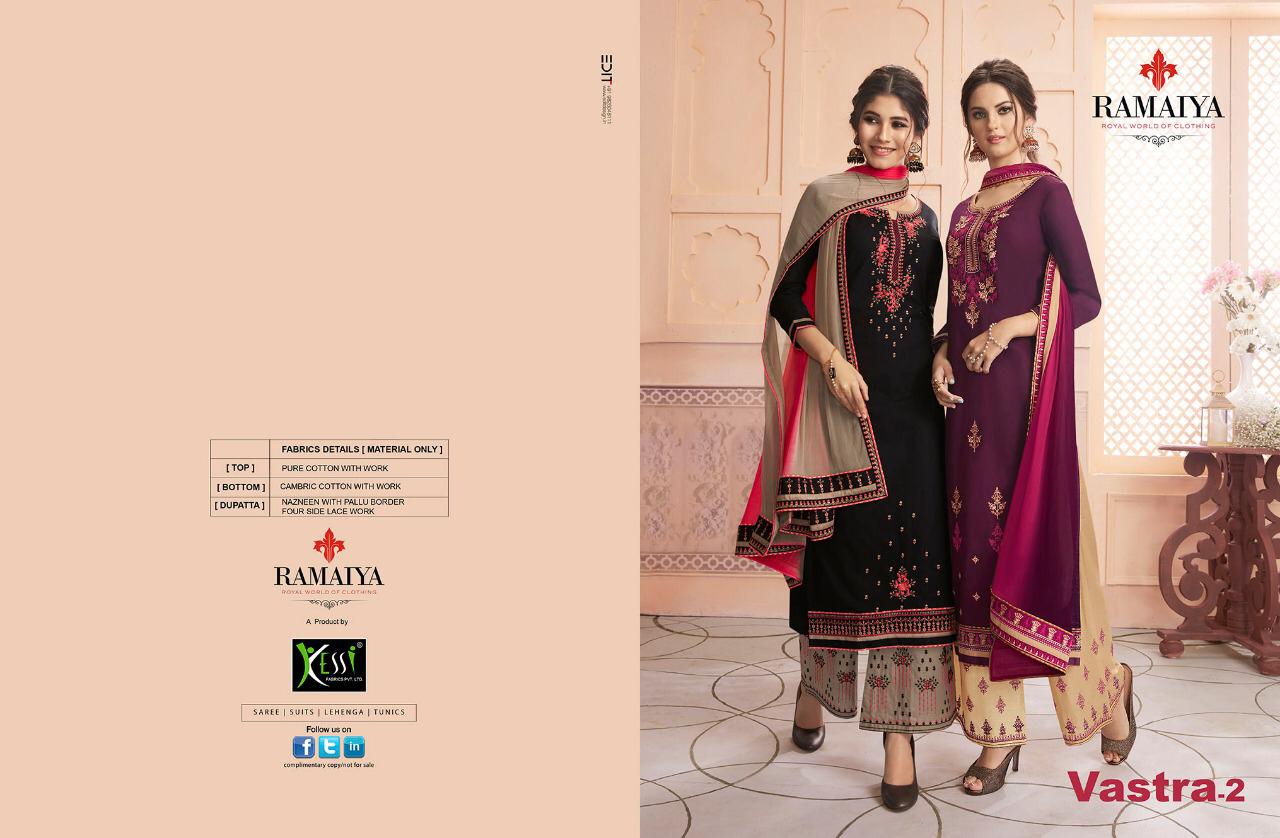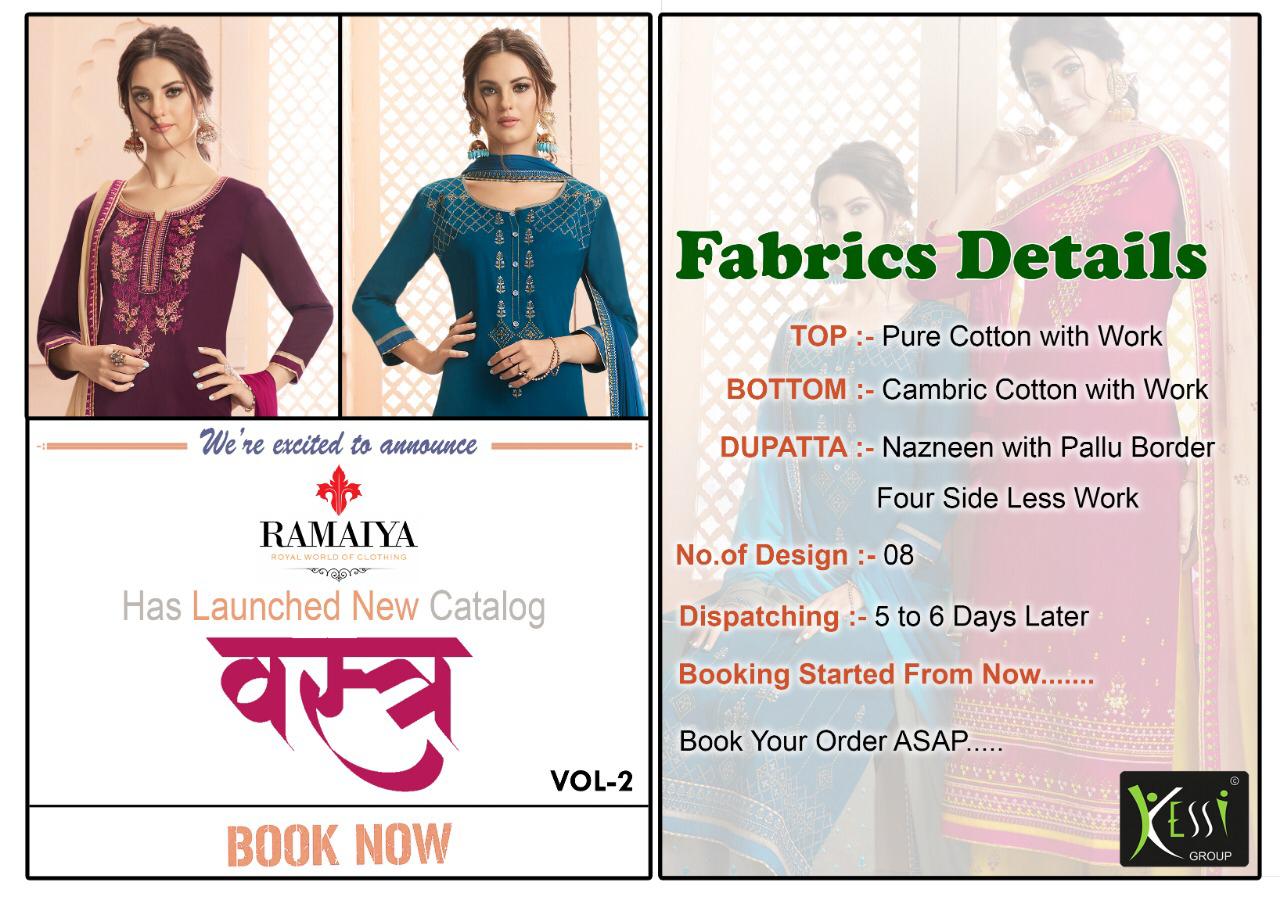 Buy Online Vastra Vol 2 By Ramaiya Cotton Dress Materials Wholesale Supplier India 8 Pcs of Full Catalogue at Wholesale Price. Looking for Vastra Vol 2 By Ramaiya Cotton Dress Materials Wholesale Supplier India Full Catalouge at Best Price? Buy Now Vastra Vol 2 By Ramaiya Cotton Dress Materials Wholesale Supplier India at Wholesale Rate of Rs 5192 with Total 8 Pcs from authroized dealer and supplier of Brand. Cost of Each piece is just only Rs 649 which is very low and affordable price to resale the product in your retail store ,This is Surat based Wholesale Supplier & Dealer of Brand. Click on Brand name to Know more about Brand's products.Call or Whatsapp on 9898838984 for booking or enquiry