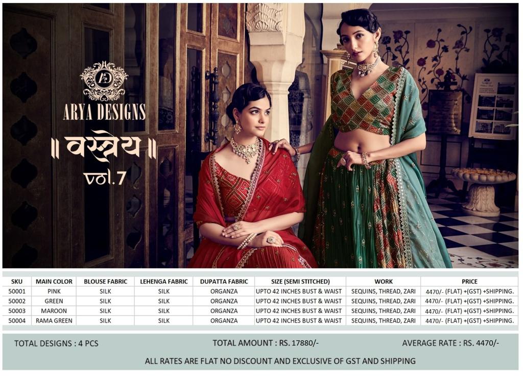Buy Online Vastrey Vol 7 By Arya Designs Fancy Stylish Heavy Lehenga Choli Collection Single Avilable Wholesaler Supplier Surat 4 Pcs of Full Catalogue at Wholesale Price. Looking for Vastrey Vol 7 By Arya Designs Fancy Stylish Heavy Lehenga Choli Collection Single Avilable Wholesaler Supplier Surat Full Catalouge at Best Price? Buy Now Vastrey Vol 7 By Arya Designs Fancy Stylish Heavy Lehenga Choli Collection Single Avilable Wholesaler Supplier Surat at Wholesale Rate of Rs 17880 with Total 4 Pcs from authroized dealer and supplier of Brand. Cost of Each piece is just only Rs 4470 which is very low and affordable price to resale the product in your retail store ,This is Surat based Wholesale Supplier & Dealer of Brand. Click on Brand name to Know more about Brand's products.Call or Whatsapp on 9898838984 for booking or enquiry
