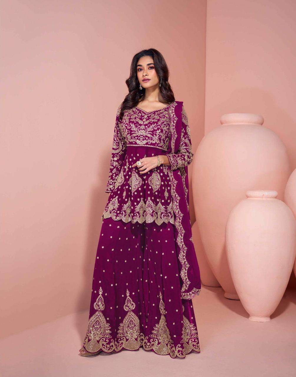 FABRIC - PREMIUM REAL GEROGETTE ( FULL HEAVY LOOK EMBROIDERED FRONT AND BACK WORK TOP , PLAZZO AND DUPATTA )