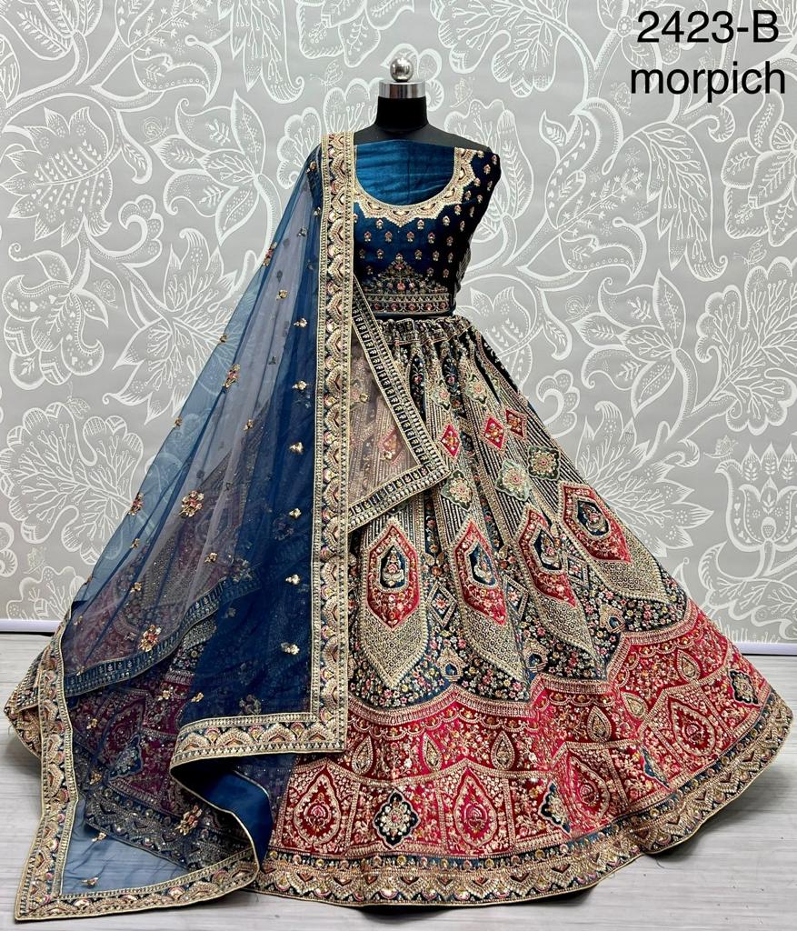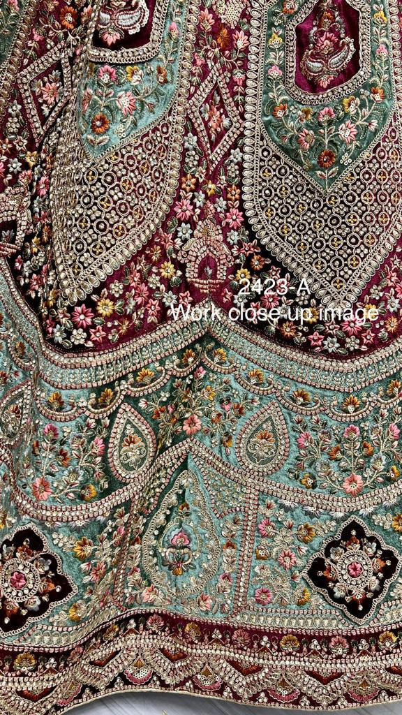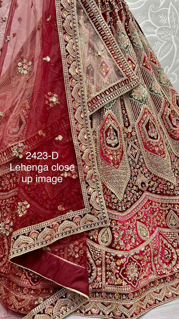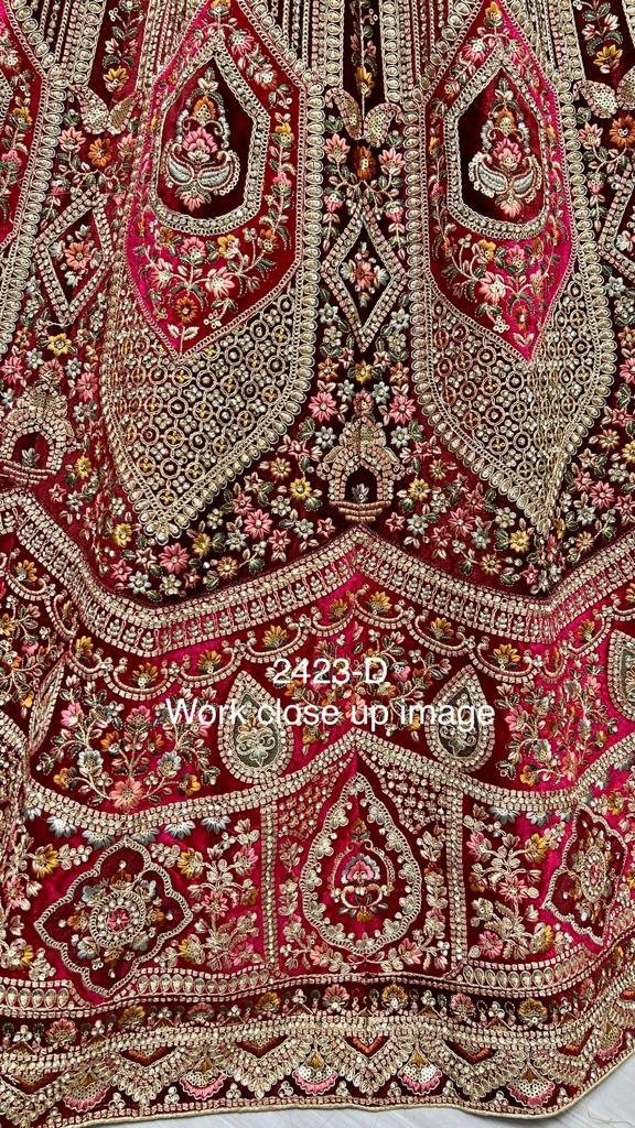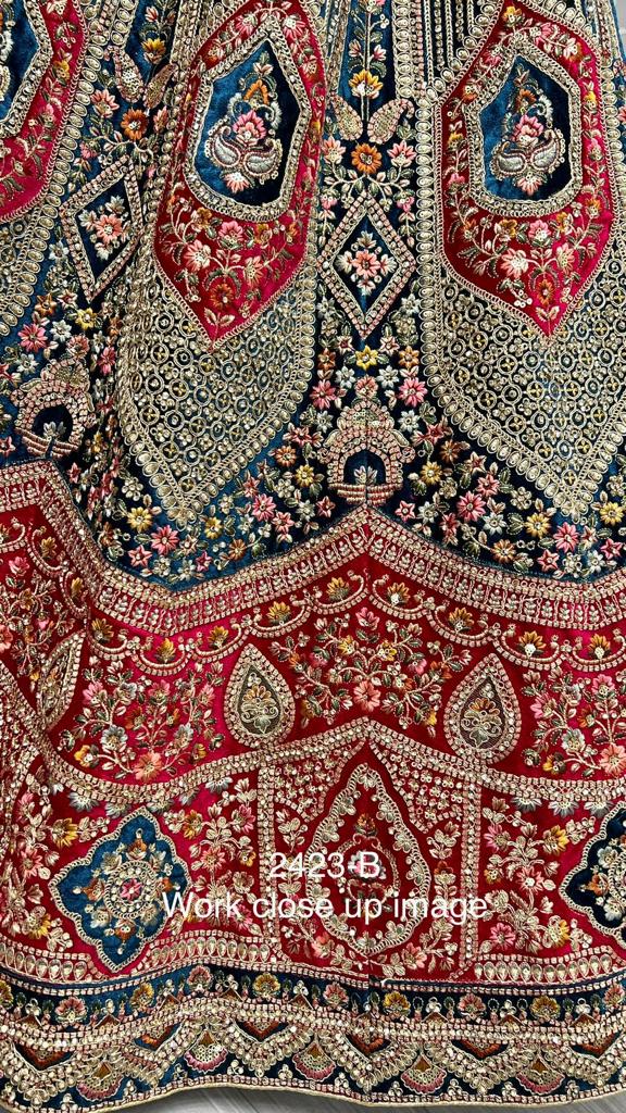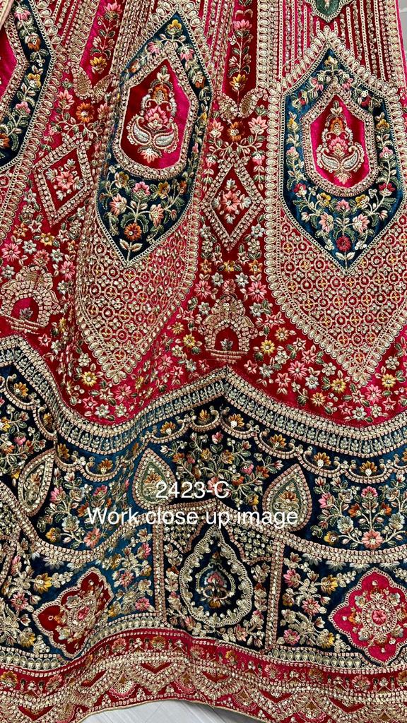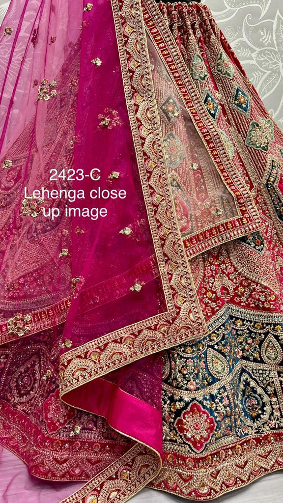 Buy Online Velvet 2423 Patch And Multi Color Combine Designer Bridal Lehengacholi With Double Dupatta 4 Pcs of Full Catalogue at Wholesale Price. Looking for Velvet 2423 Patch And Multi Color Combine Designer Bridal Lehengacholi With Double Dupatta Full Catalouge at Best Price? Buy Now Velvet 2423 Patch And Multi Color Combine Designer Bridal Lehengacholi With Double Dupatta at Wholesale Rate of Rs 67996 with Total 4 Pcs from authroized dealer and supplier of Brand. Cost of Each piece is just only Rs 16999 which is very low and affordable price to resale the product in your retail store ,This is Surat based Wholesale Supplier & Dealer of Brand. Click on Brand name to Know more about Brand's products.Call or Whatsapp on 9898838984 for booking or enquiry