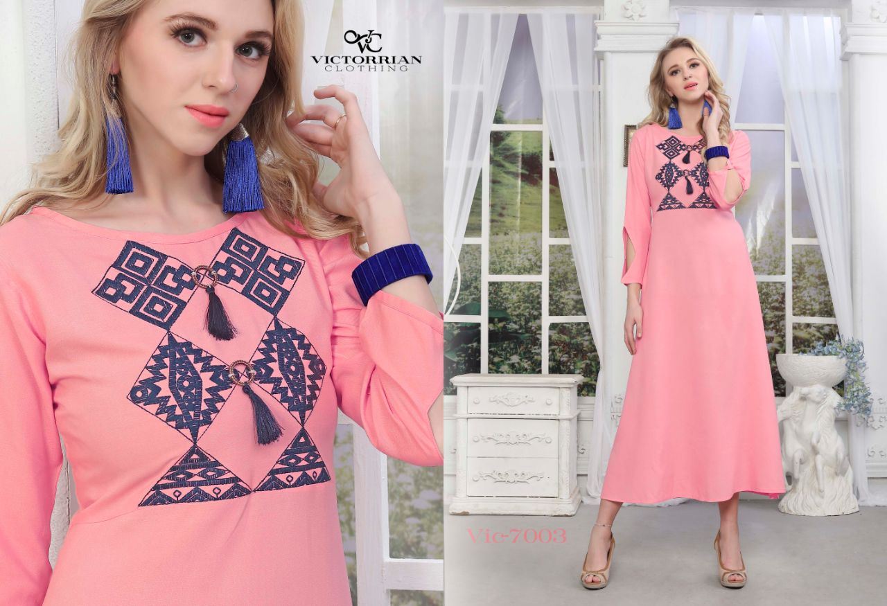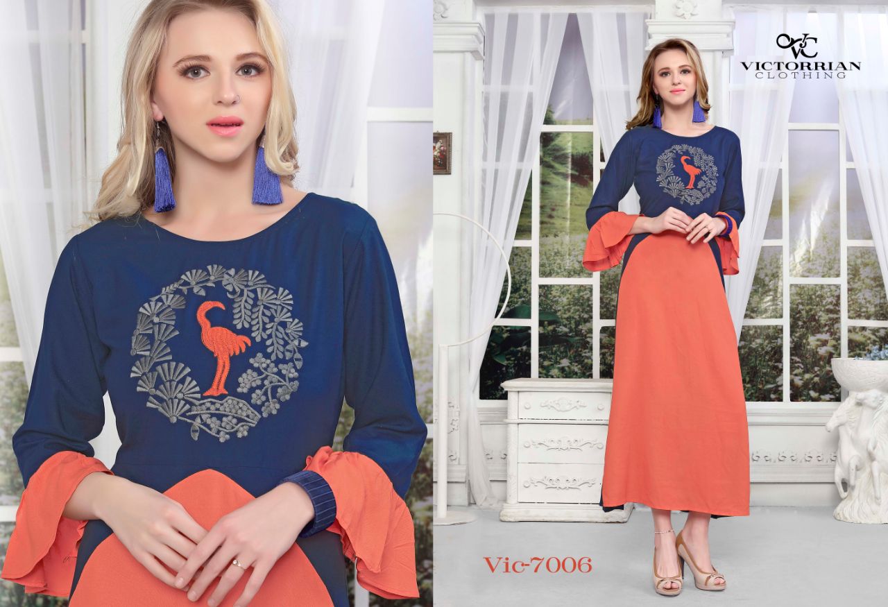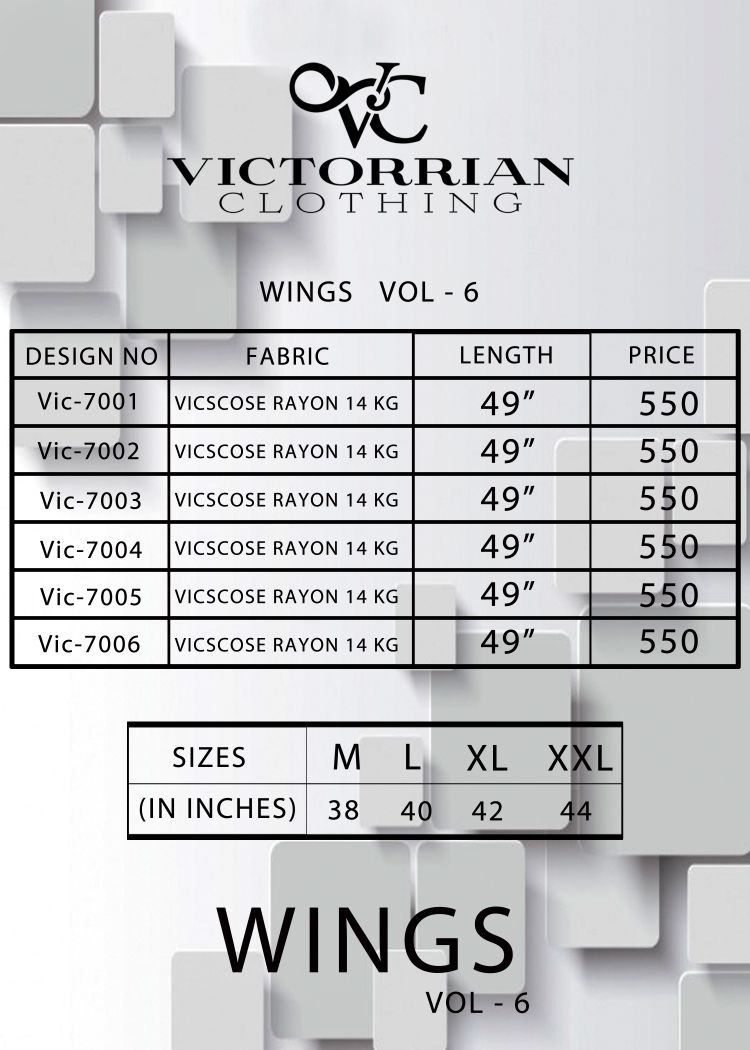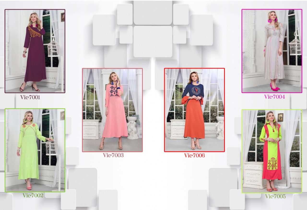 Buy Online Victoria Wings Vol 6 7001 To 7006 Series Fancy Reyon Kurti 6 Pcs of Full Catalogue at Wholesale Price. Looking for Victoria Wings Vol 6 7001 To 7006 Series Fancy Reyon Kurti Full Catalouge at Best Price? Buy Now Victoria Wings Vol 6 7001 To 7006 Series Fancy Reyon Kurti at Wholesale Rate of Rs 3300 with Total 6 Pcs from authroized dealer and supplier of Victoria Brand. Cost of Each piece is just only Rs 550 which is very low and affordable price to resale the product in your retail store ,This is Surat based Wholesale Supplier & Dealer of Victoria Brand. Click on Brand name to Know more about Victoria Brand's products.Call or Whatsapp on 9898838984 for booking or enquiry