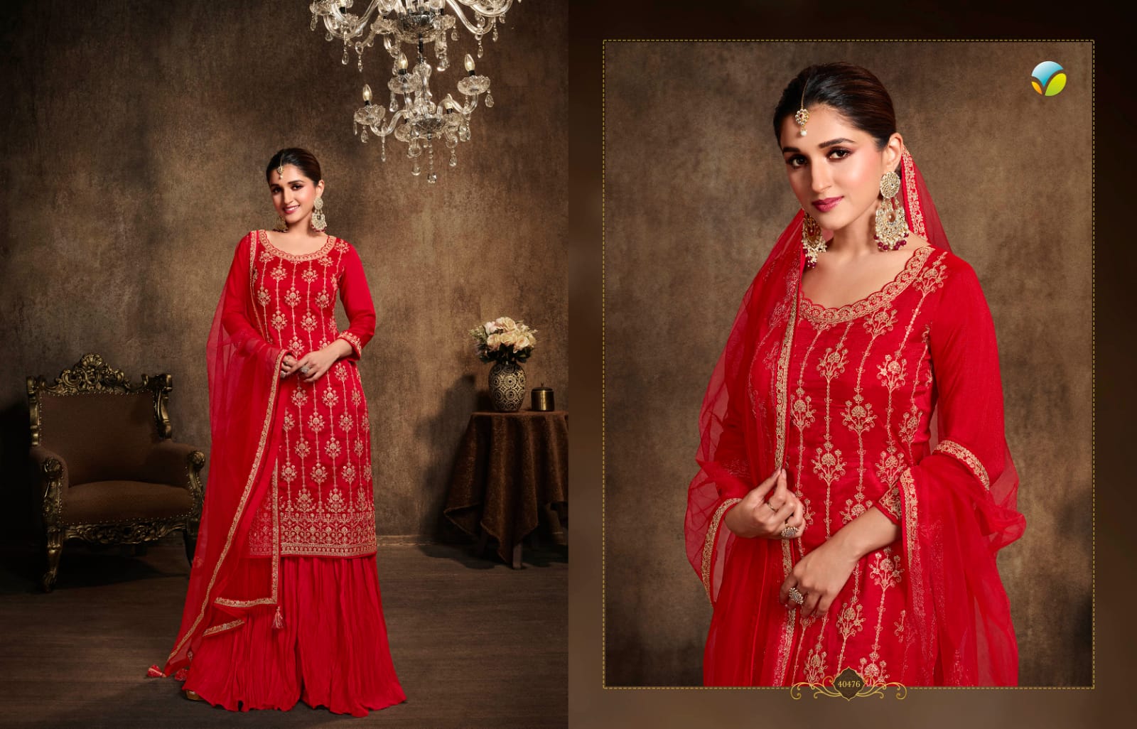 *TUMBAA - RAAS* *READYMADE SUITS COLLECTION* *FABRIC DETAILS* *EMBROIDERED SILK GEORGETTE KURTA WITH CRUSHED SILK GEORGETTE SHARARA AND EMBROIDERED NET DUPATTA* *SIZE : M-L-XL-2XL-3XL* |