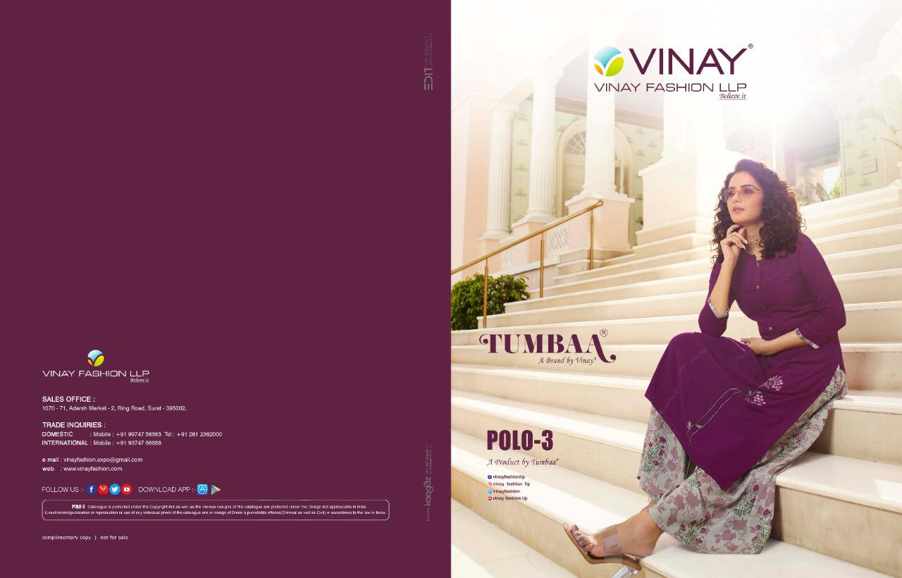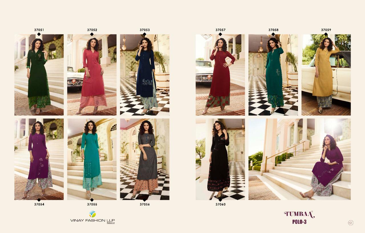 Buy Online Vinay Tumbaa Polo 3 Reyon Kurtis With Plazzo Wholesale Supplier Surat 10 Pcs of Full Catalogue at Wholesale Price. Looking for Vinay Tumbaa Polo 3 Reyon Kurtis With Plazzo Wholesale Supplier Surat Full Catalouge at Best Price? Buy Now Vinay Tumbaa Polo 3 Reyon Kurtis With Plazzo Wholesale Supplier Surat at Wholesale Rate of Rs 8450 with Total 10 Pcs from authroized dealer and supplier of VINAY Brand. Cost of Each piece is just only Rs 845 which is very low and affordable price to resale the product in your retail store ,This is Surat based Wholesale Supplier & Dealer of VINAY Brand. Click on Brand name to Know more about VINAY Brand's products.Call or Whatsapp on 9898838984 for booking or enquiry