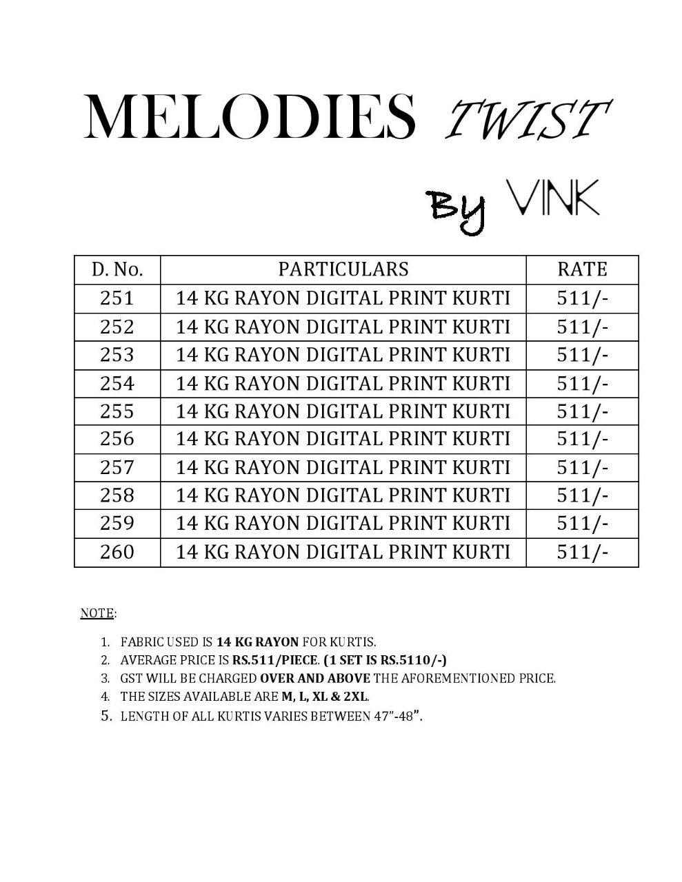 Buy Online Vink Melodies Twist 251 Series Reyon Digital Printed Kurti Catlog Wholesale Dealer And Supplier Surat 10 Pcs of Full Catalogue at Wholesale Price. Looking for Vink Melodies Twist 251 Series Reyon Digital Printed Kurti Catlog Wholesale Dealer And Supplier Surat Full Catalouge at Best Price? Buy Now Vink Melodies Twist 251 Series Reyon Digital Printed Kurti Catlog Wholesale Dealer And Supplier Surat at Wholesale Rate of Rs 5110 with Total 10 Pcs from authroized dealer and supplier of VINK Brand. Cost of Each piece is just only Rs 511 which is very low and affordable price to resale the product in your retail store ,This is Surat based Wholesale Supplier & Dealer of VINK Brand. Click on Brand name to Know more about VINK Brand's products.Call or Whatsapp on 9898838984 for booking or enquiry