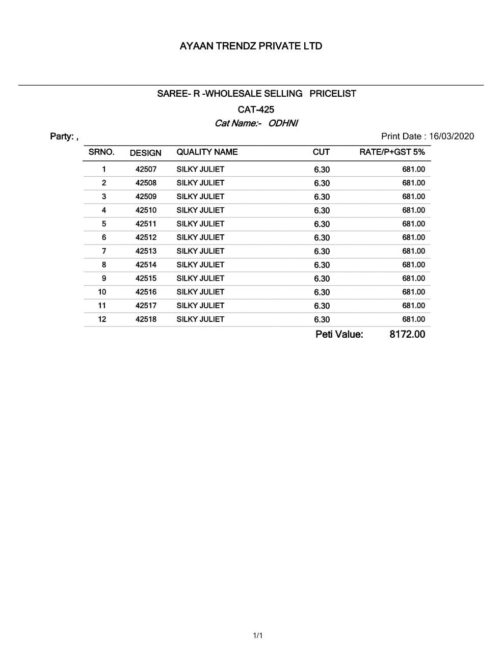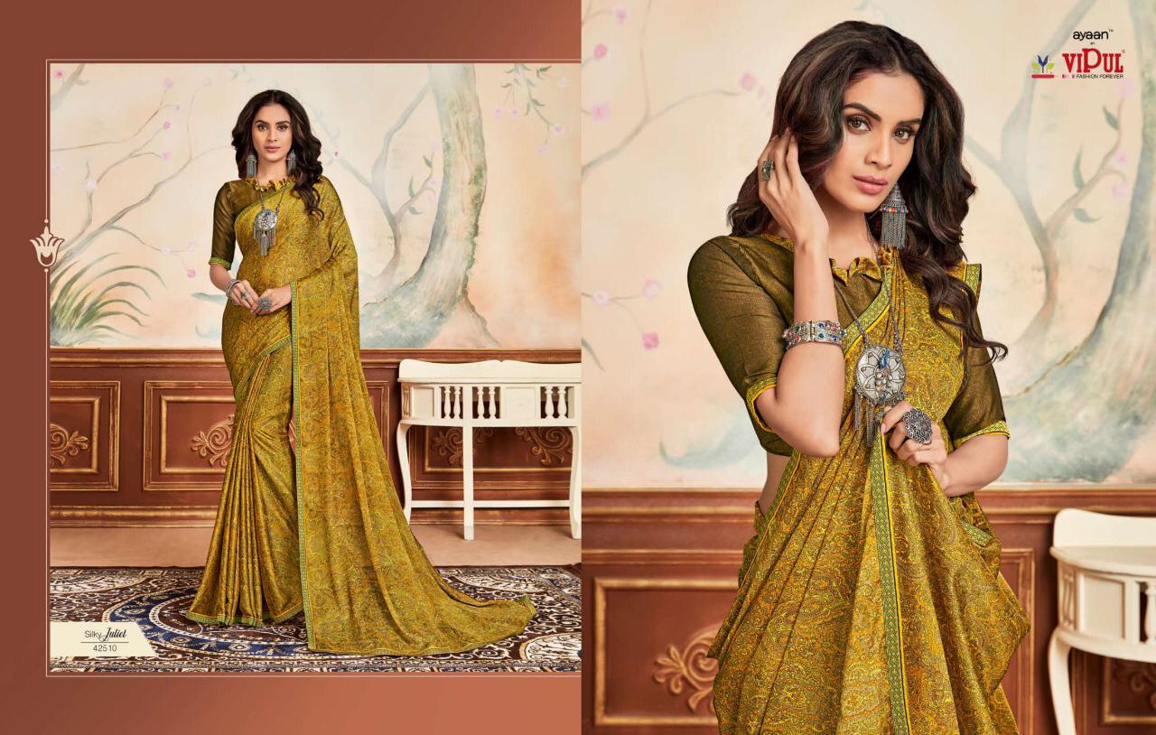 Buy Online Vipul Cat 425 Odhni Series 42507 To 42518 Chiffon Sarees Wholesale Supplier And Dealer Gujarat 12 Pcs of Full Catalogue at Wholesale Price. Looking for Vipul Cat 425 Odhni Series 42507 To 42518 Chiffon Sarees Wholesale Supplier And Dealer Gujarat Full Catalouge at Best Price? Buy Now Vipul Cat 425 Odhni Series 42507 To 42518 Chiffon Sarees Wholesale Supplier And Dealer Gujarat at Wholesale Rate of Rs 8172 with Total 12 Pcs from authroized dealer and supplier of VIPUL Brand. Cost of Each piece is just only Rs 681 which is very low and affordable price to resale the product in your retail store ,This is Surat based Wholesale Supplier & Dealer of VIPUL Brand. Click on Brand name to Know more about VIPUL Brand's products.Call or Whatsapp on 9898838984 for booking or enquiry