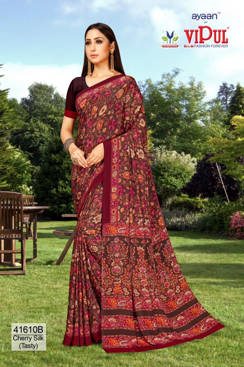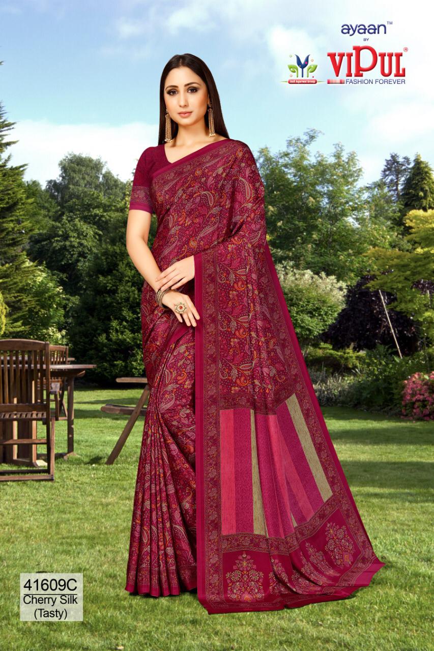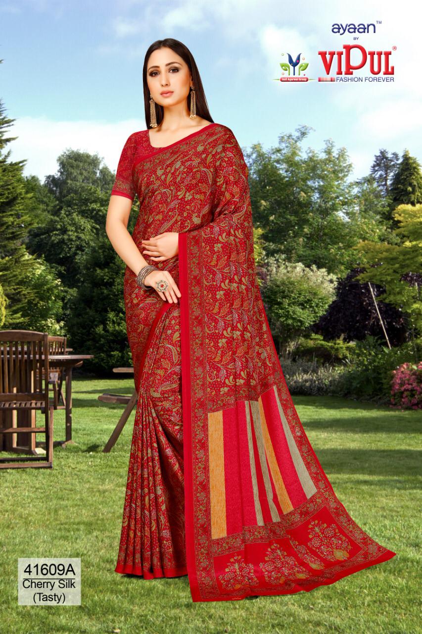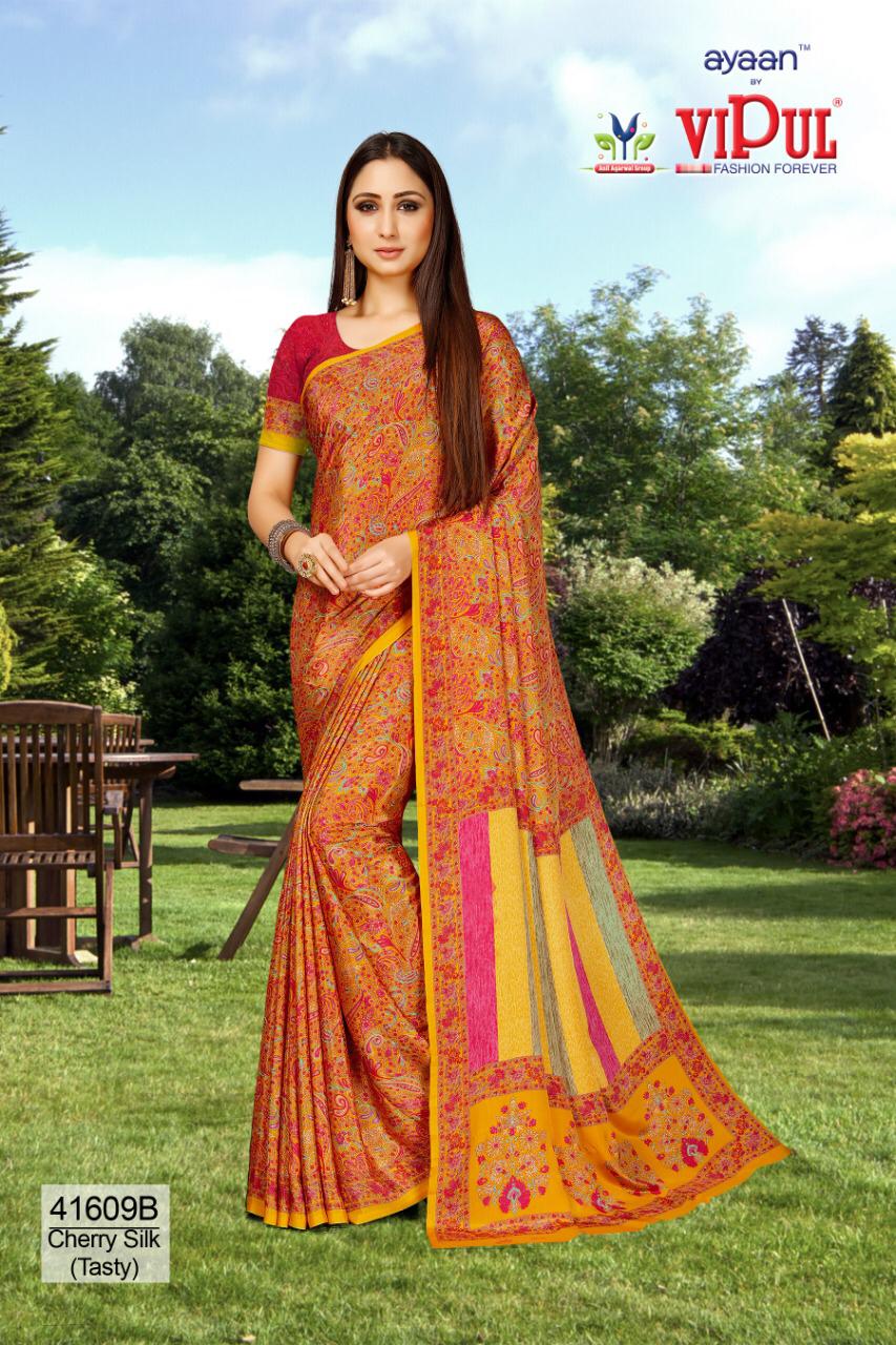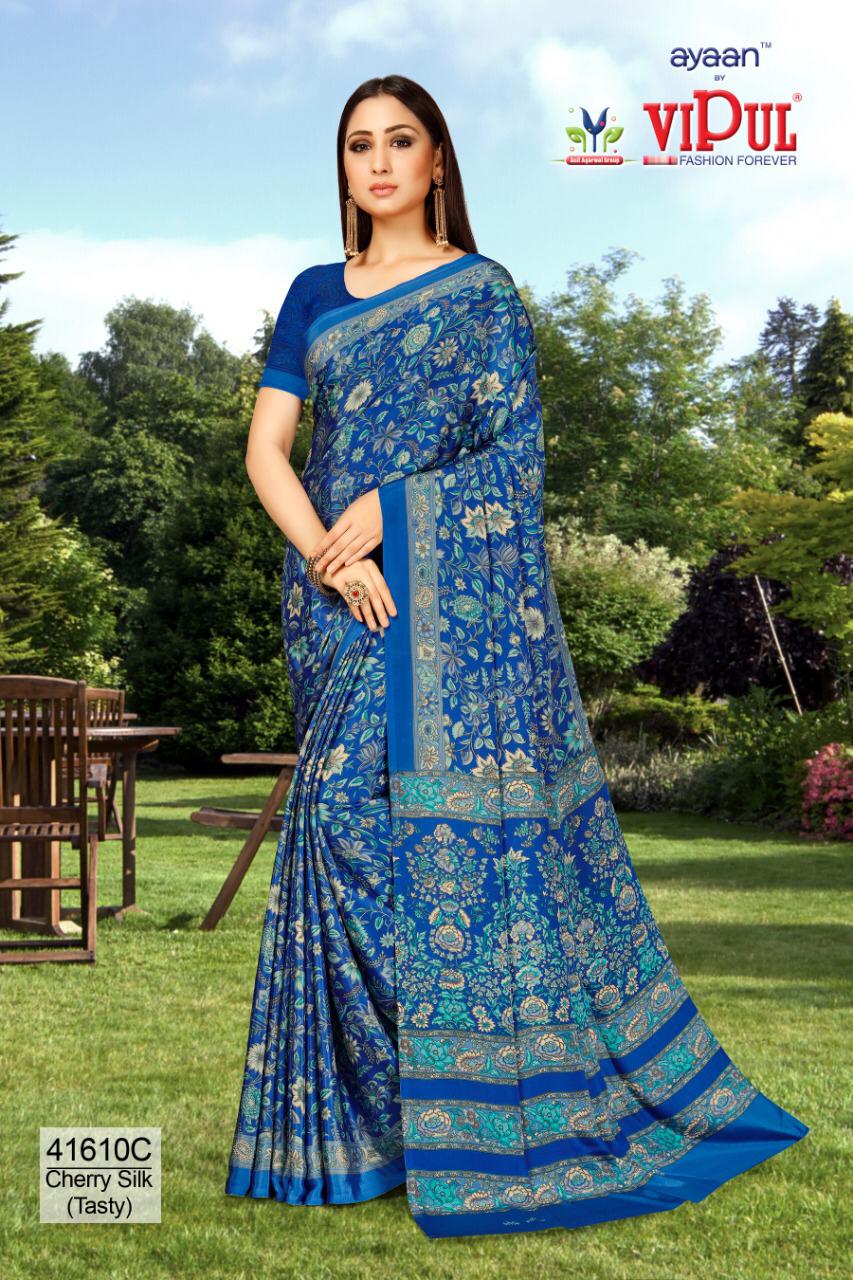 Brand - Vipul . Type - saree. Colours of Hit degien. 41609, 41610, 41611. Catlog name - Cherry silk ( Tasty) Rate- 550 per Pcs . * set & loose & singel * Single 650/- Fabric- Silky Crape . GST 5 Percent Extra. Delivery from today |