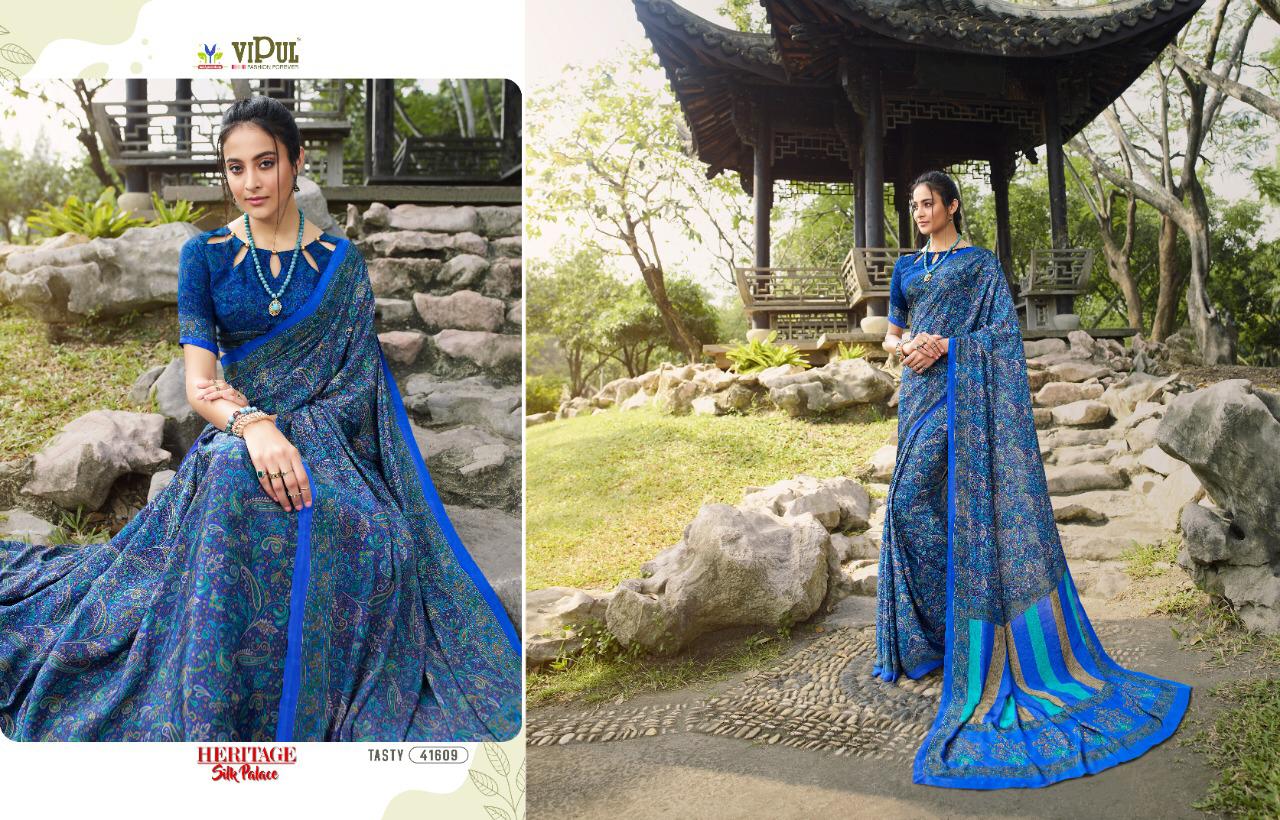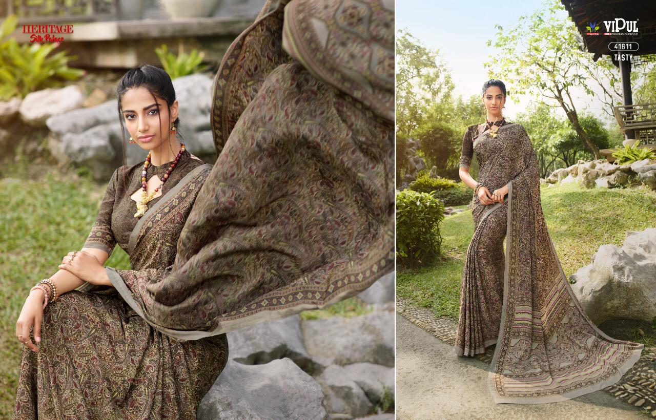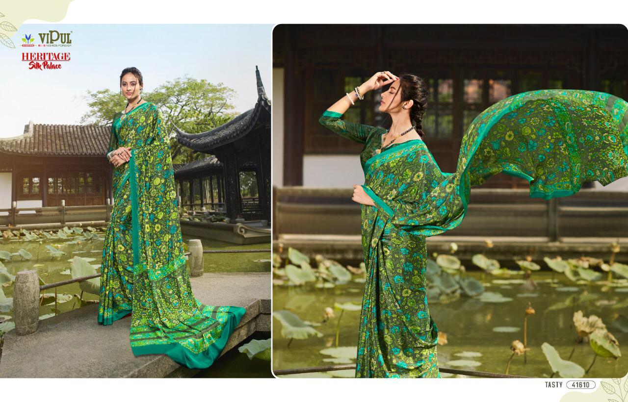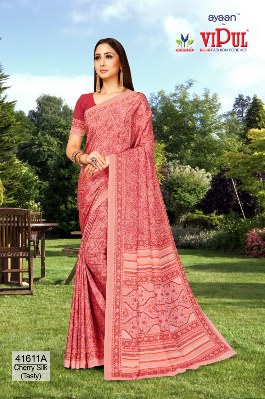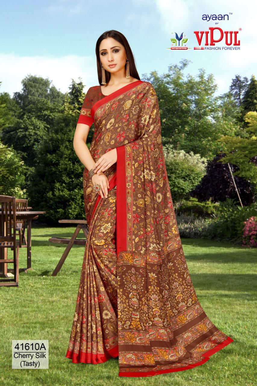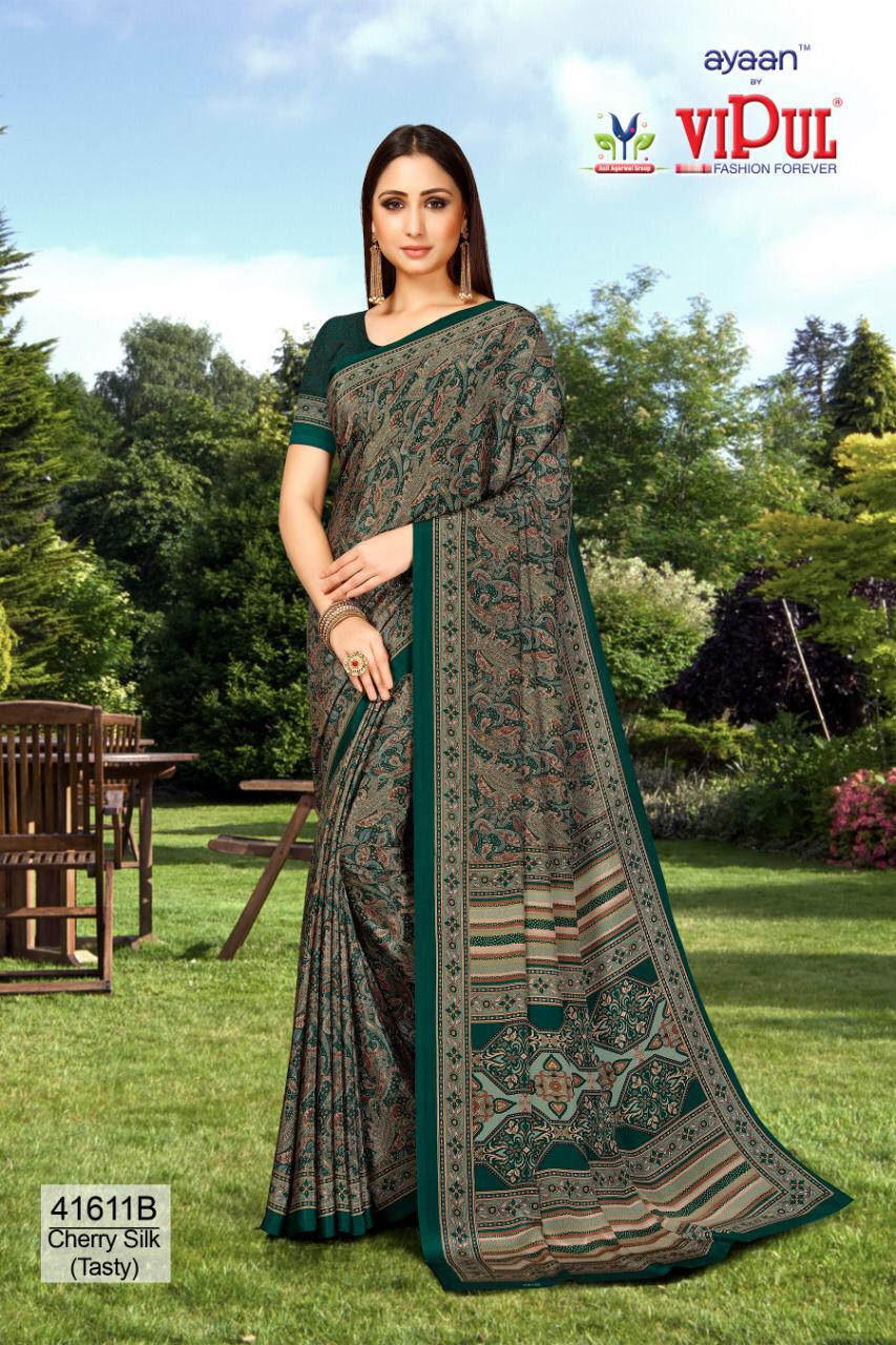 Brand - Vipul . Type - saree. Colours of Hit degien. 41609, 41610, 41611. Catlog name - Cherry silk ( Tasty) Rate- 550 per Pcs . * set & loose & singel * Single 650/- Fabric- Silky Crape . GST 5 Percent Extra. Delivery from today |