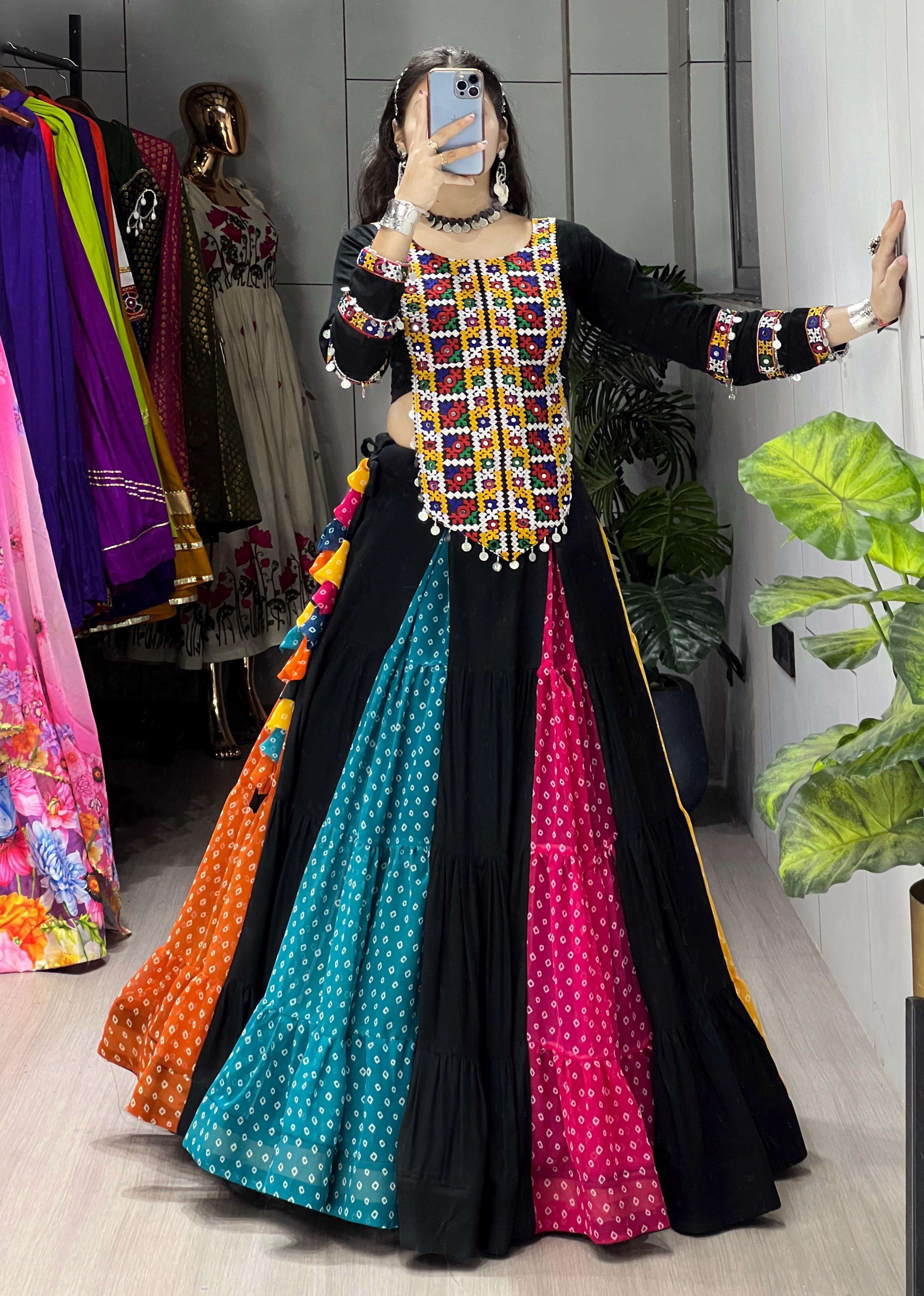 ⚡ Flaunt ethnic elegance with this colorful Navratri choli set! Perfect for dandiya nights, this outfit is crafted with multicolor panels, Bandhani prints, and Kutchi work – finished with real mirrors for that festive sparkle.