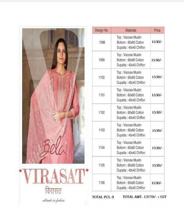 Brand - Bela . Type - suit . Catlog name - VIRASAT . Series - 1098 to 1106. Set to set. GST 5 Percent Extra. Delivery from tomorrow |