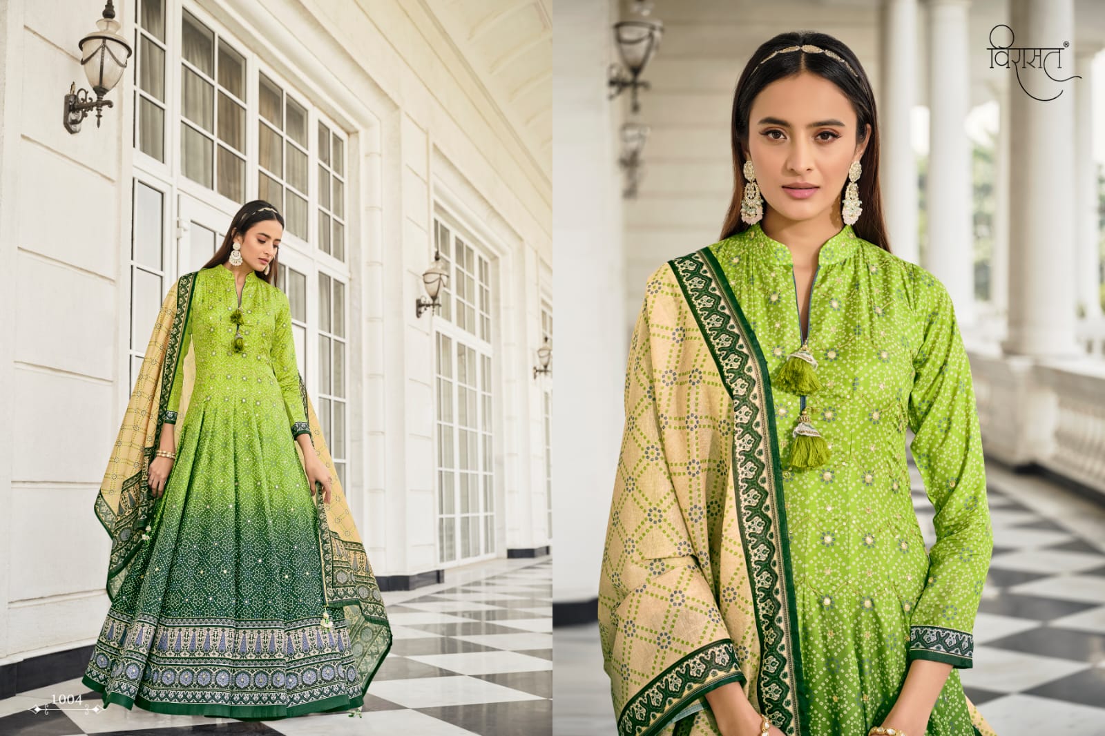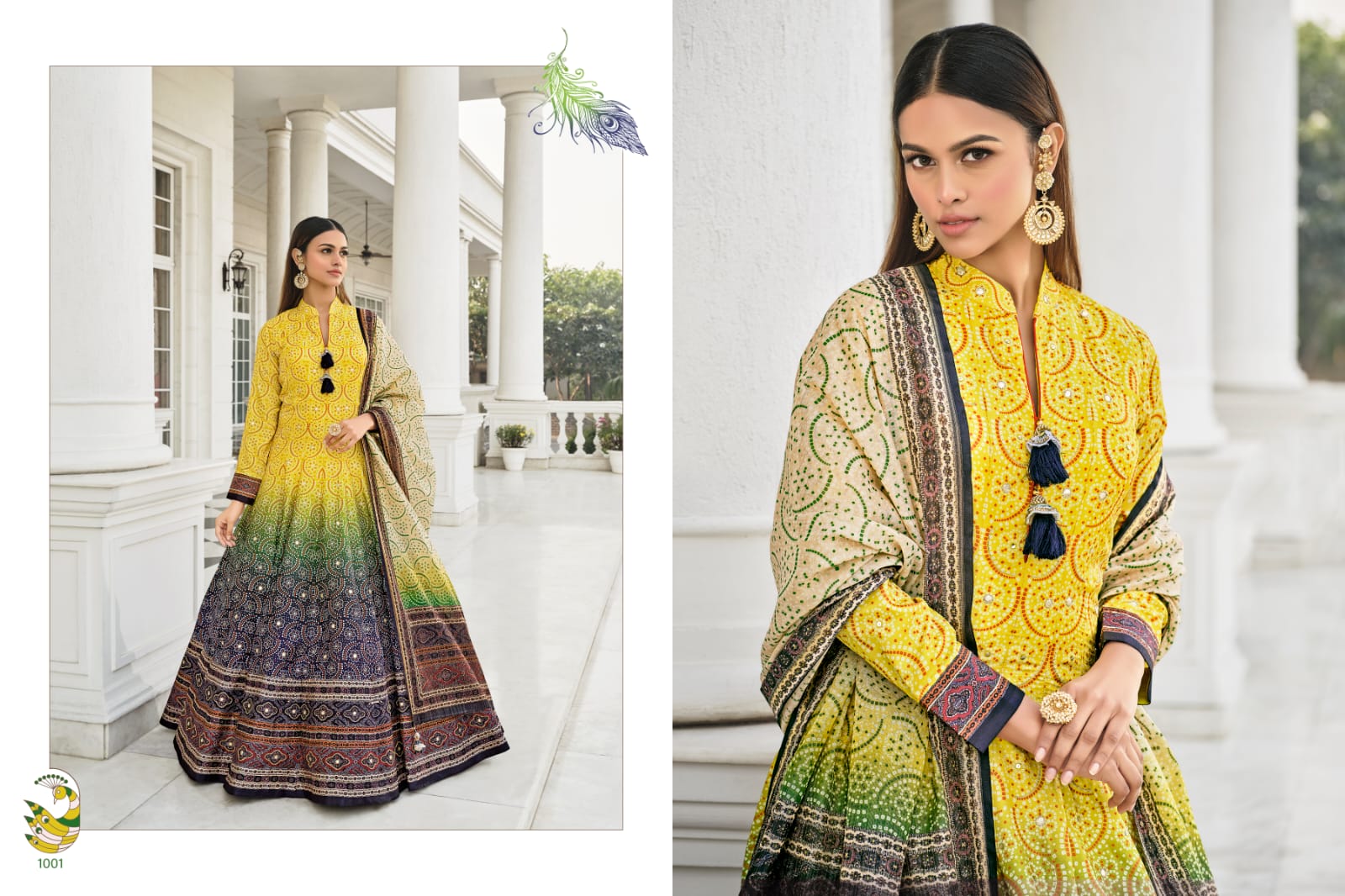 ?? *We Have Launch Our New Series* ?? *Virasat Vol MOREPINCH* Designer Gown Exclusive Collection Fabric Details :- Gown :- DOLLA Silk Work :- Bandhani print Long hendwork and designer latkan kali Inner :- Full inner In all Designs With cancan net Duppata :- Jeqard + Digital print Length :- Max up to 58 Flair : 4.5 Meter* Size :- L(40), XL(42), XXL(44). Type :- stitched. Weight :- 2 kg. Total *6* Designs. *RATE* 1001- 3495/- 1002 - 3495/- 1003 - 3495/- 1004 - 3495/- 1005 - 3495/- 1006 - 3495/- *Gst ship extra * *Ready stock* Single available 100+Singles |