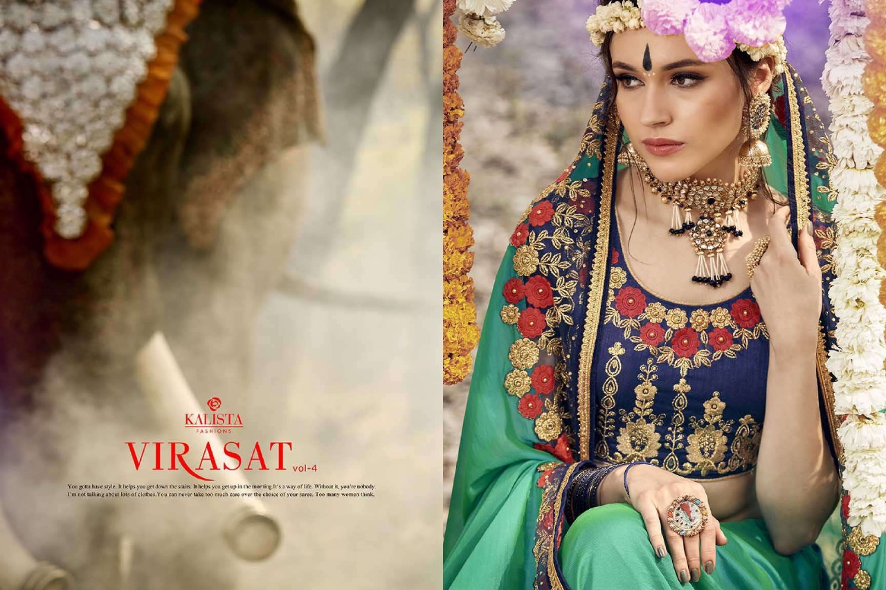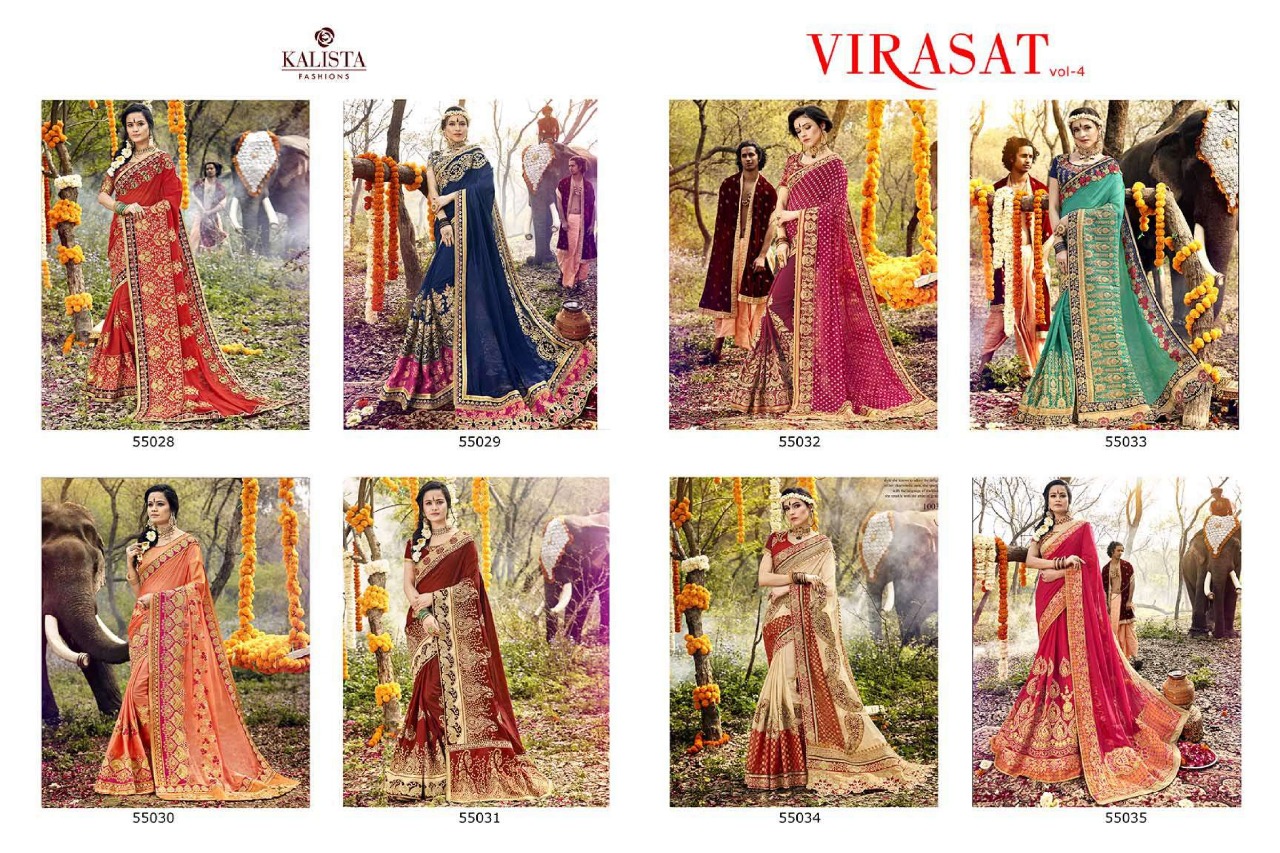 Buy Online Virasat Vol 4 By Kalista Series 55028 To 55035 Designer Party Wear Sarees Wholesale Supplier And Dealer Surat 8 Pcs of Full Catalogue at Wholesale Price. Looking for Virasat Vol 4 By Kalista Series 55028 To 55035 Designer Party Wear Sarees Wholesale Supplier And Dealer Surat Full Catalouge at Best Price? Buy Now Virasat Vol 4 By Kalista Series 55028 To 55035 Designer Party Wear Sarees Wholesale Supplier And Dealer Surat at Wholesale Rate of Rs 14800 with Total 8 Pcs from authroized dealer and supplier of KALISTA FASHION Brand. Cost of Each piece is just only Rs 1850 which is very low and affordable price to resale the product in your retail store ,This is Surat based Wholesale Supplier & Dealer of KALISTA FASHION Brand. Click on Brand name to Know more about KALISTA FASHION Brand's products.Call or Whatsapp on 9898838984 for booking or enquiry