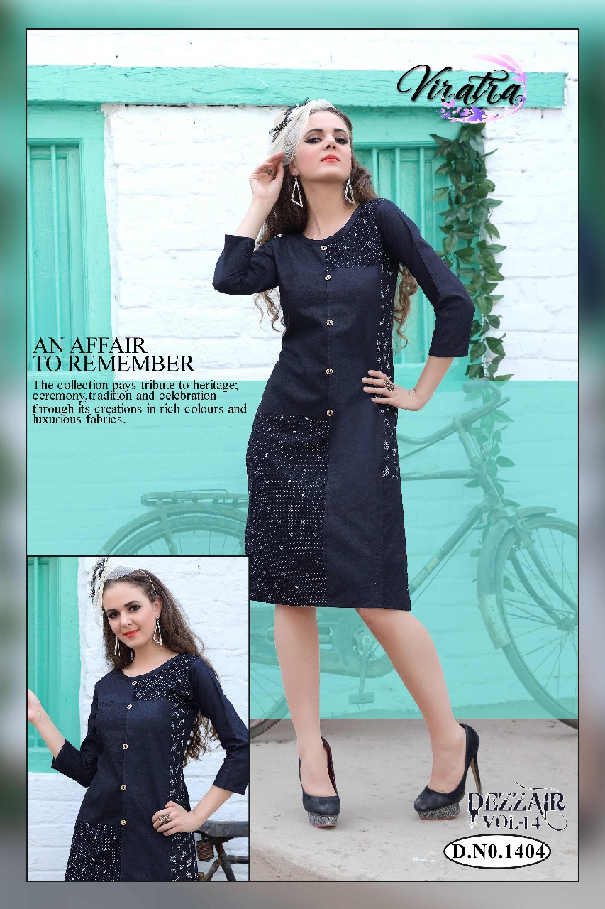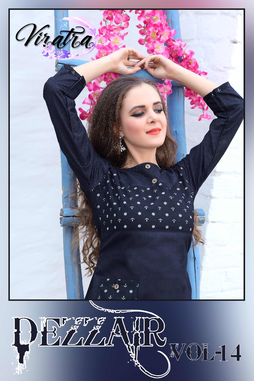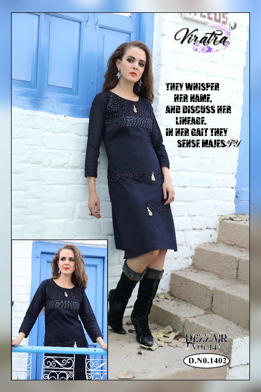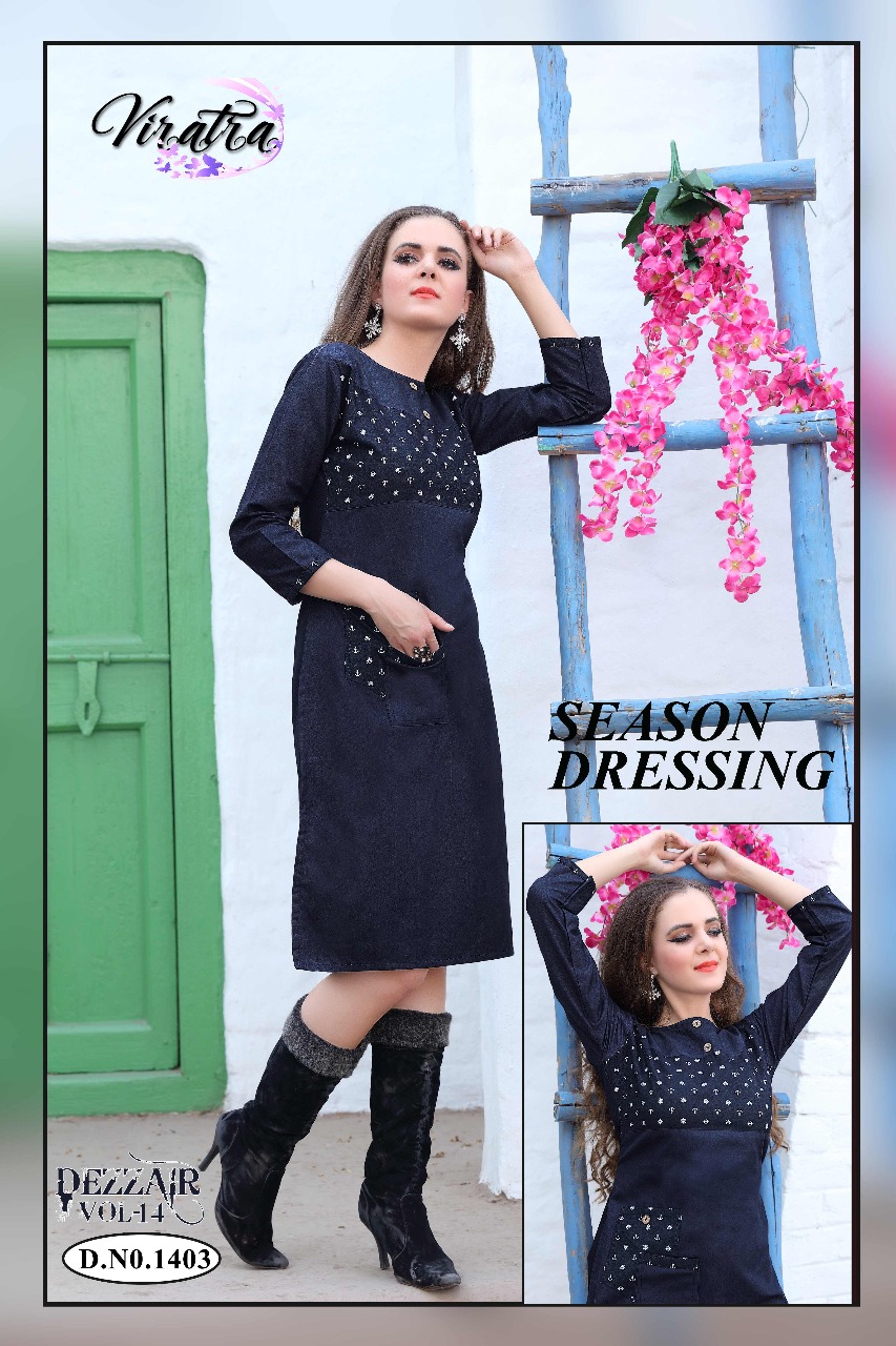 Buy Online Viratra Dezzair Vol 14 1401 Series Denim Kurti Collection 8 Pcs of Full Catalogue at Wholesale Price. Looking for Viratra Dezzair Vol 14 1401 Series Denim Kurti Collection Full Catalouge at Best Price? Buy Now Viratra Dezzair Vol 14 1401 Series Denim Kurti Collection at Wholesale Rate of Rs 3192 with Total 8 Pcs from authroized dealer and supplier of VIRATRA Brand. Cost of Each piece is just only Rs 399 which is very low and affordable price to resale the product in your retail store ,This is Surat based Wholesale Supplier & Dealer of VIRATRA Brand. Click on Brand name to Know more about VIRATRA Brand's products.Call or Whatsapp on 9898838984 for booking or enquiry