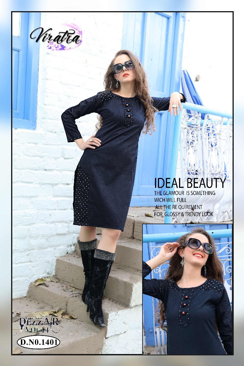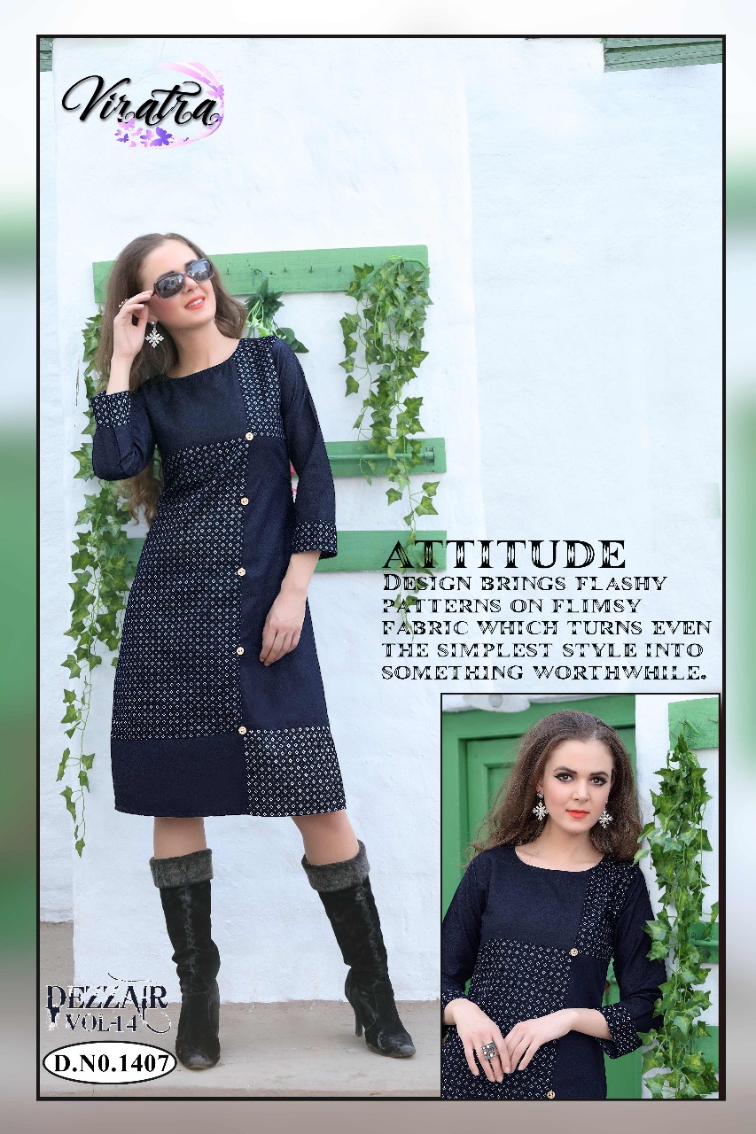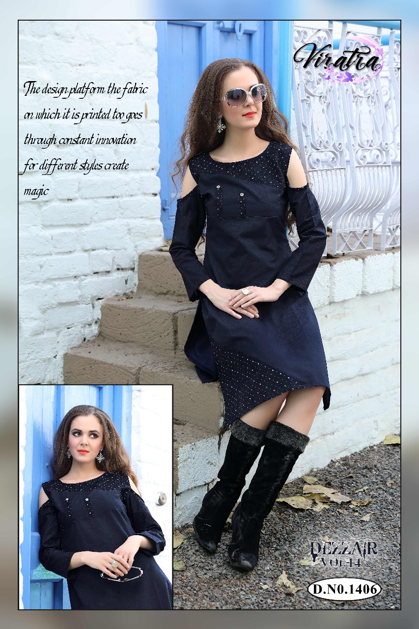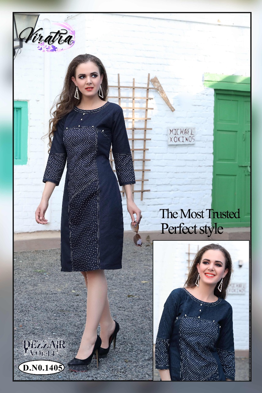 Buy Online Viratra Dezzair Vol 14 1401 Series Denim Kurti Collection 8 Pcs of Full Catalogue at Wholesale Price. Looking for Viratra Dezzair Vol 14 1401 Series Denim Kurti Collection Full Catalouge at Best Price? Buy Now Viratra Dezzair Vol 14 1401 Series Denim Kurti Collection at Wholesale Rate of Rs 3192 with Total 8 Pcs from authroized dealer and supplier of VIRATRA Brand. Cost of Each piece is just only Rs 399 which is very low and affordable price to resale the product in your retail store ,This is Surat based Wholesale Supplier & Dealer of VIRATRA Brand. Click on Brand name to Know more about VIRATRA Brand's products.Call or Whatsapp on 9898838984 for booking or enquiry