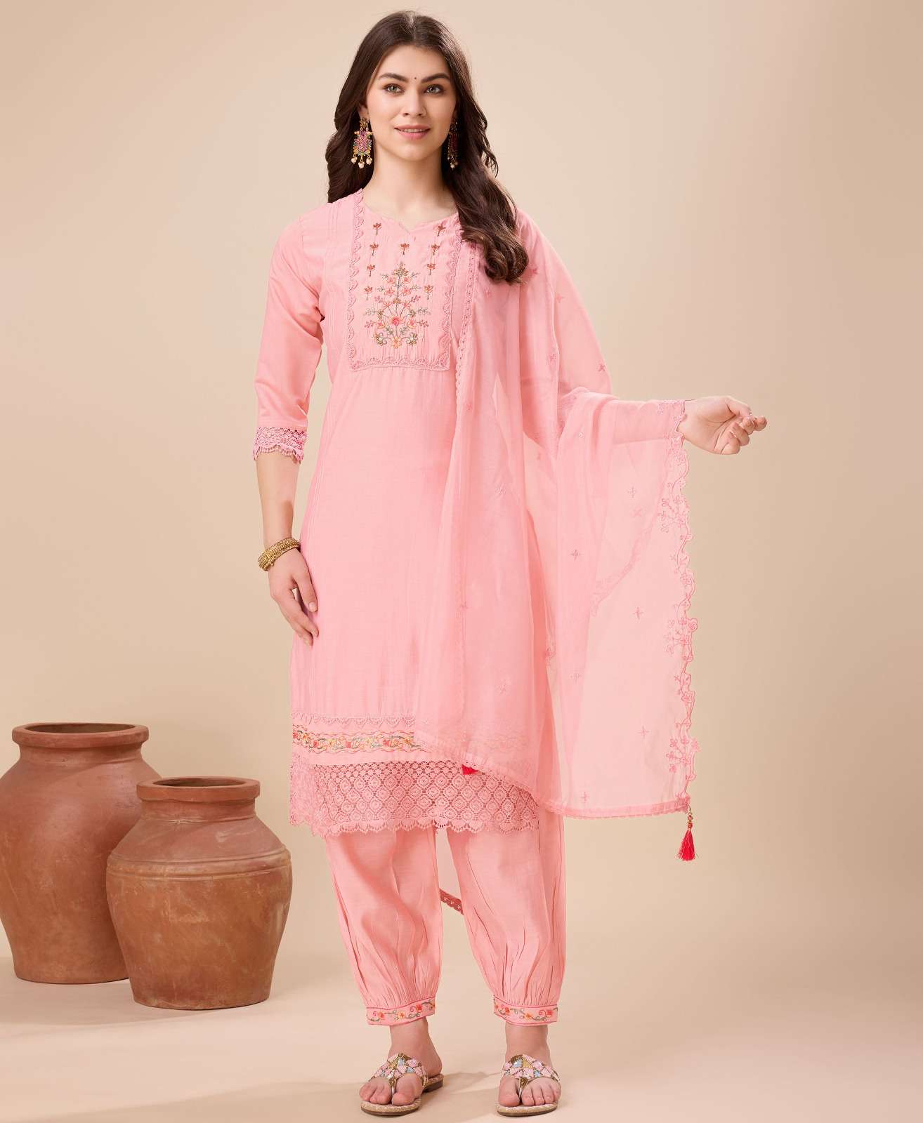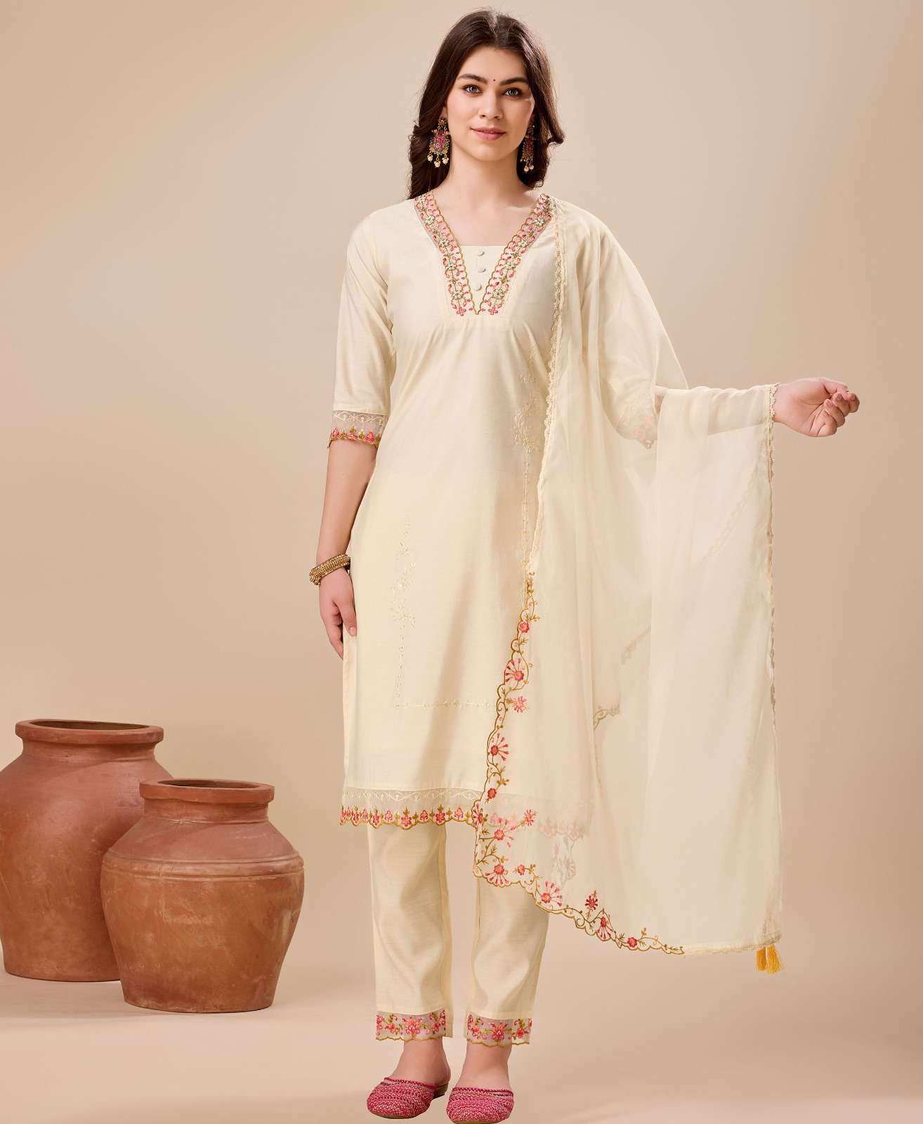 Top: Viscose Silk Embroidered Calf Length Kurta Bottom: Viscose Silk Embroidered Pant Dupatta: Organza Embroidered Cutwork Dupatta