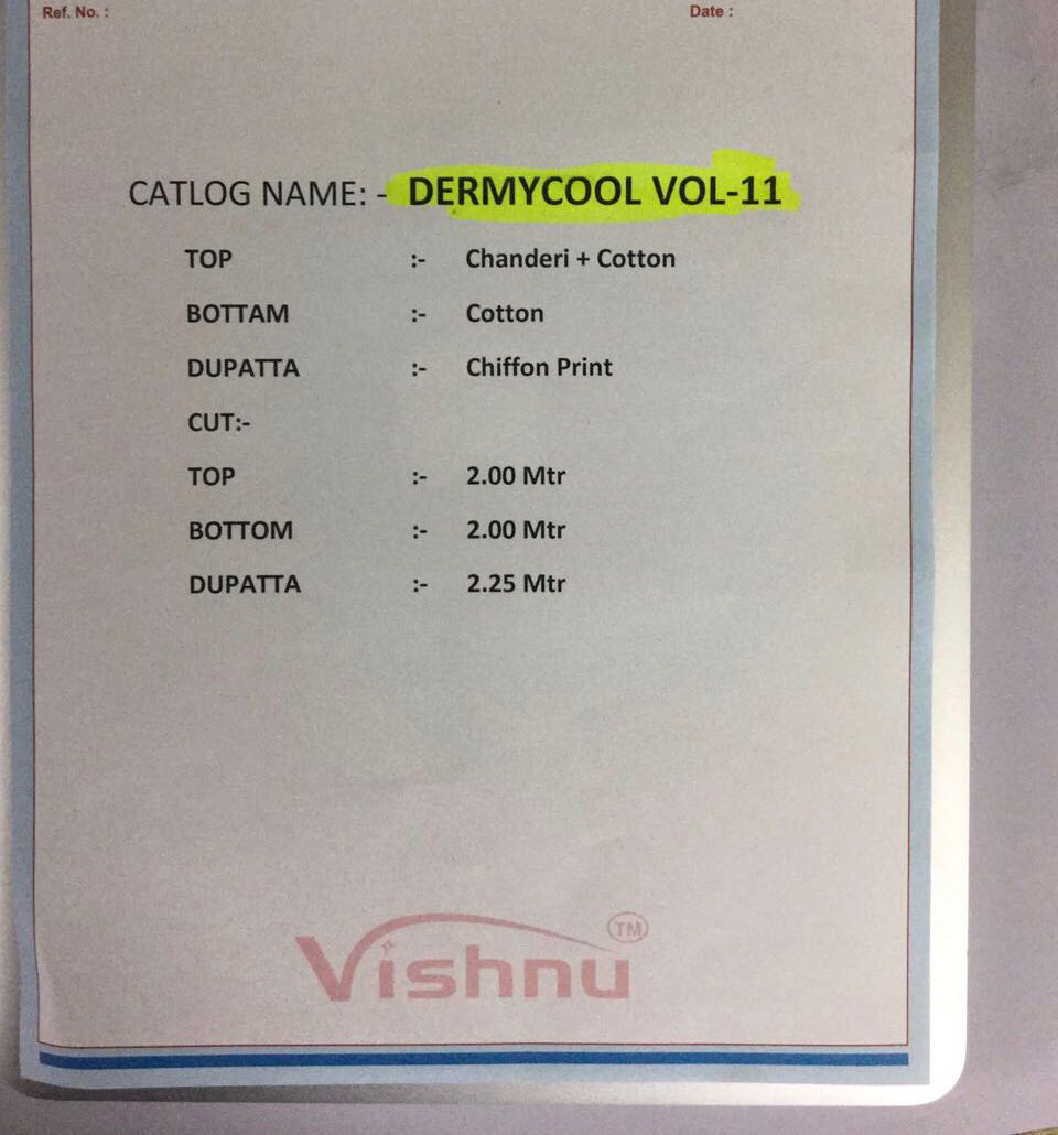 Brand - Vishnu Impex . Catlog name - DERMY COOL -11. Rate -450 per Pcs . Set to set . GST 5 Percent Extra. Delivery date -12-05-18. Book your order |
