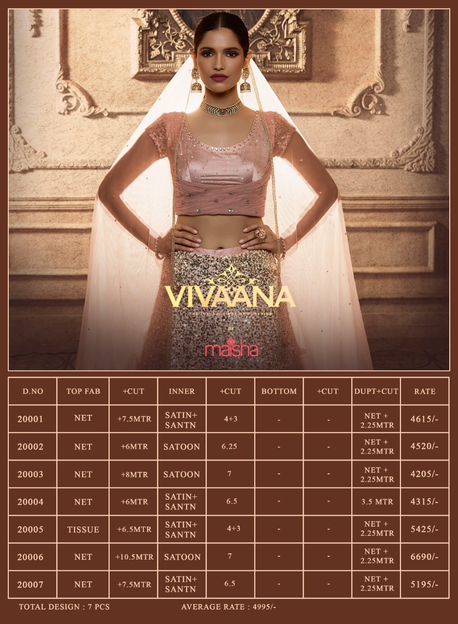 Brand - Maiisa Maskeen. Type - Lehenga . Catlog Name - VIVAANA . Series -20001 to 20007. GST 12 Percent Extra. Delivery 7 days . Book your order |