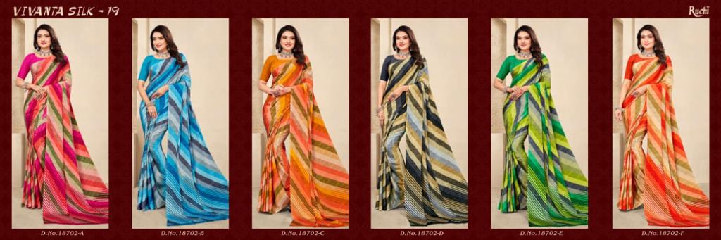 Hello, BRAND NAME - *Ruchi* Sarees Presents CATALOG NAME - *VIVANTA SILK-19*. SERIES - *18702A TO 19302F* Pcs - 06. Fabric Â?crepe silk. RATE - 606/- per pcs GST 5% EXTRA Delivery from tomorrow BOOK YOUR ORDER NOW SINGLE AVAILABLE 100+single |
