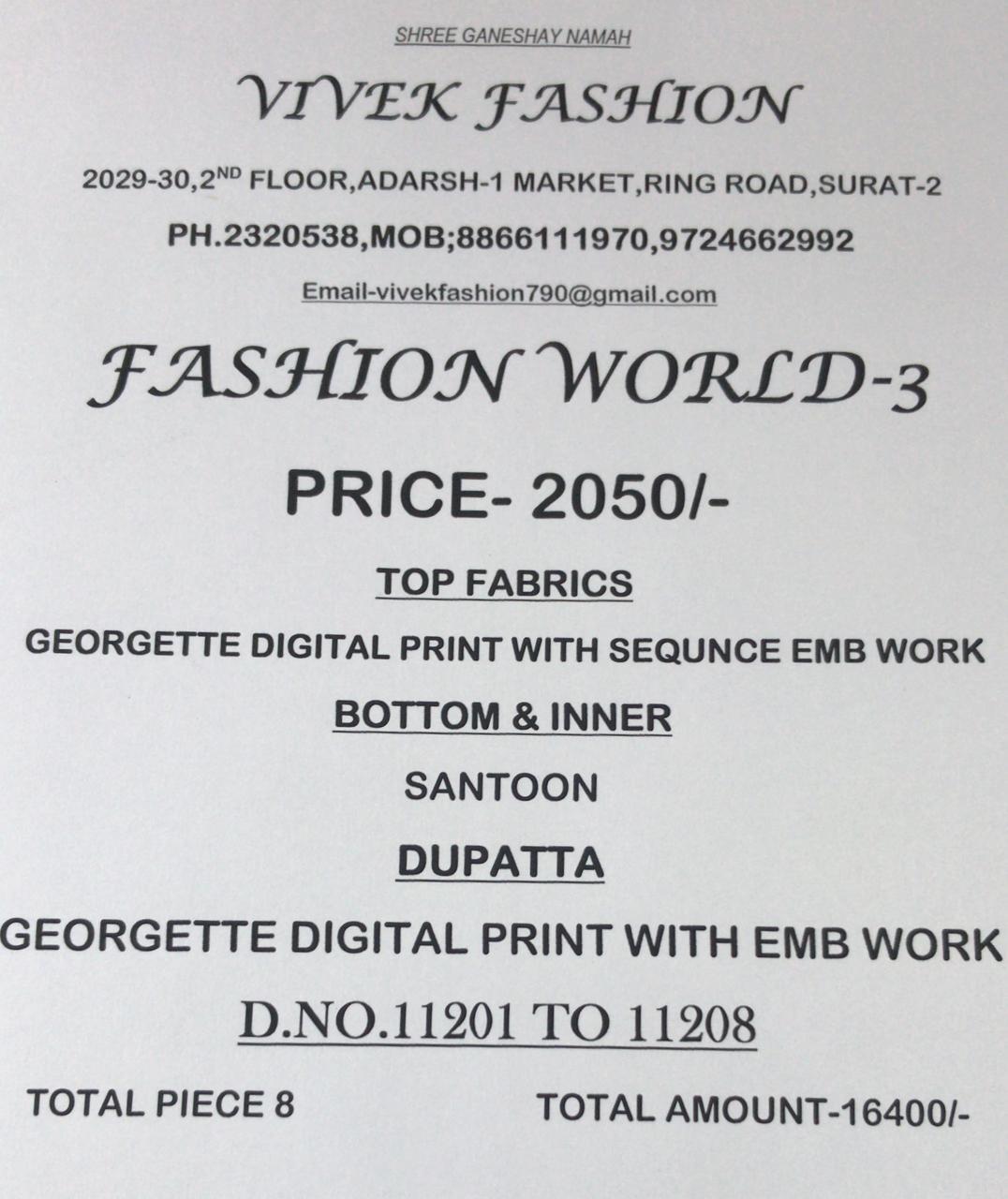 Buy Online Vivek Fashion World 3 Series 11201 To 11208 Designer Party Wear Suits Wholesale Supplier Gujarat 8 Pcs of Full Catalogue at Wholesale Price. Looking for Vivek Fashion World 3 Series 11201 To 11208 Designer Party Wear Suits Wholesale Supplier Gujarat Full Catalouge at Best Price? Buy Now Vivek Fashion World 3 Series 11201 To 11208 Designer Party Wear Suits Wholesale Supplier Gujarat at Wholesale Rate of Rs 16400 with Total 8 Pcs from authroized dealer and supplier of VIVEK FASHION Brand. Cost of Each piece is just only Rs 2050 which is very low and affordable price to resale the product in your retail store ,This is Surat based Wholesale Supplier & Dealer of VIVEK FASHION Brand. Click on Brand name to Know more about VIVEK FASHION Brand's products.Call or Whatsapp on 9898838984 for booking or enquiry