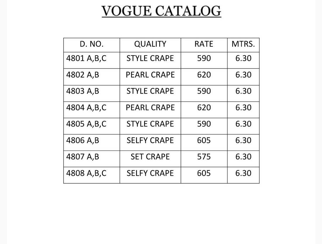 Brand - Susham . Catlog name - VOGUE . Set to set. GST 5 Percent Extra. Delivery 2 days digital Crepe new catalog Rate list atteched in pics |