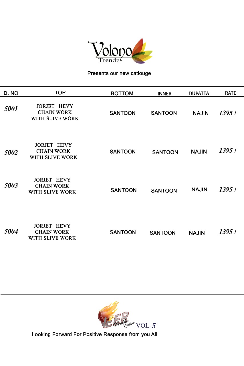 Volono trendz 5001 to 5004. Set & Loose . GST 5 Percent Extra. Delivery in 4-5 days . Book your order For singles price call or whatsapp on +919898838984 |